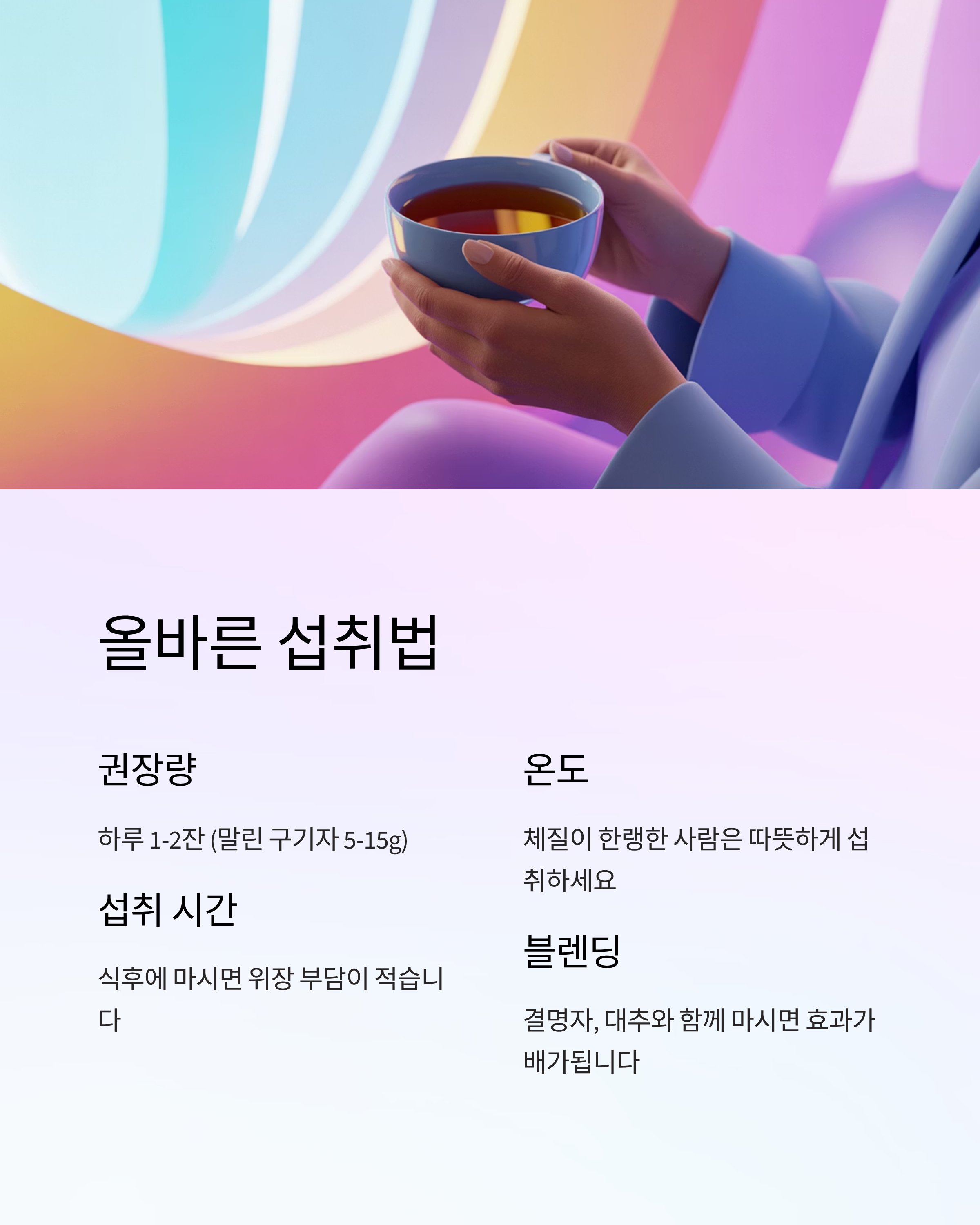 - 하루 1~2잔(약 100~200ml 기준 또는 말린 구기자 5~15g 내외) 정도를 권장