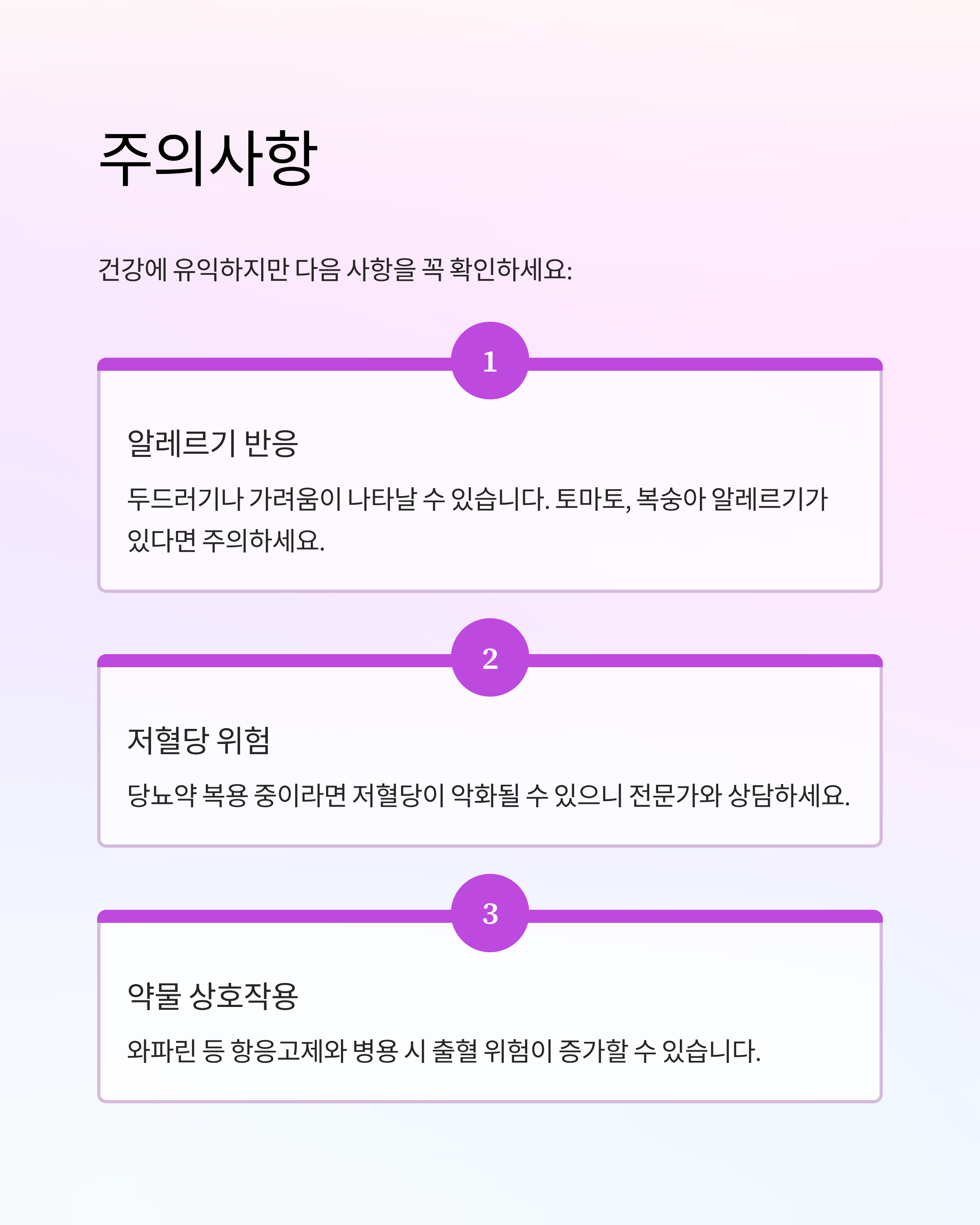 - 복용 중인 혈당 강하제와의 상호작용 가능성이 있으므로 반드시 전문가와 상담 필요합니다.