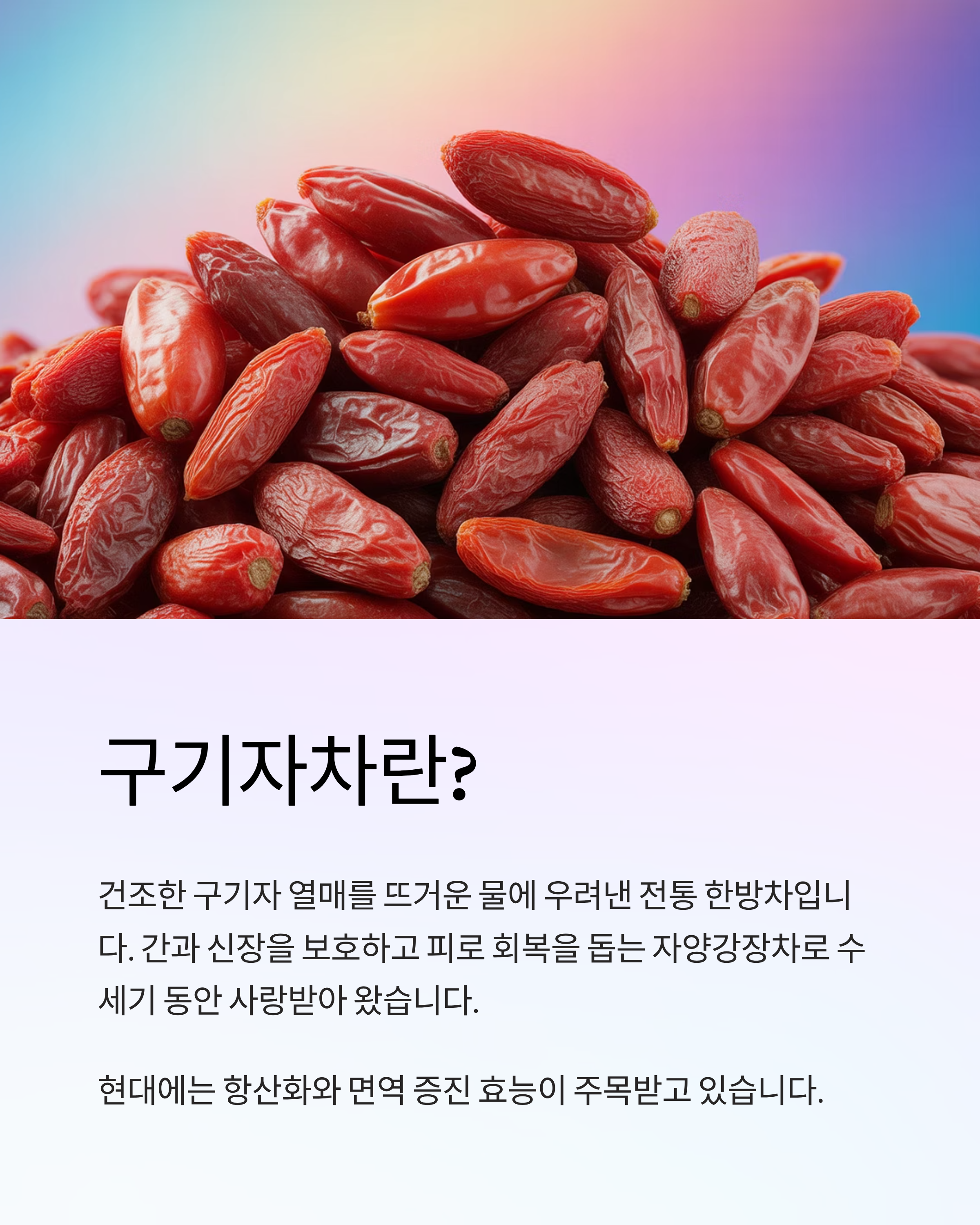 이처럼 구기자에는 항산화·면역·눈 건강·간 보호 등 다양한 기능성 성분이 포괄적으로 들어 있습니다.