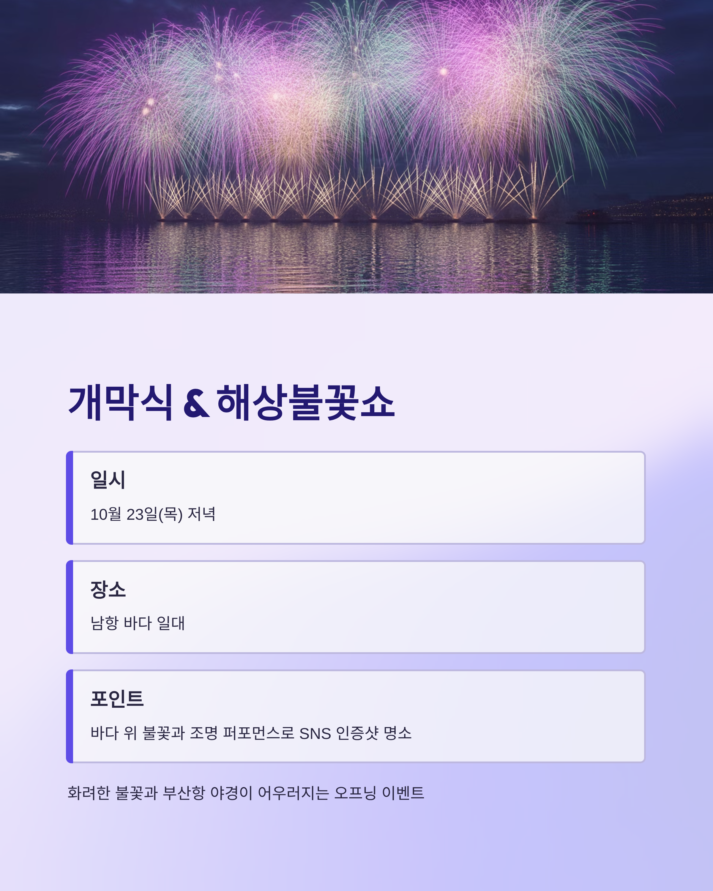 - 내용: 화려한 불꽃과 부산항 야경이 어우러지는 오프닝 이벤트