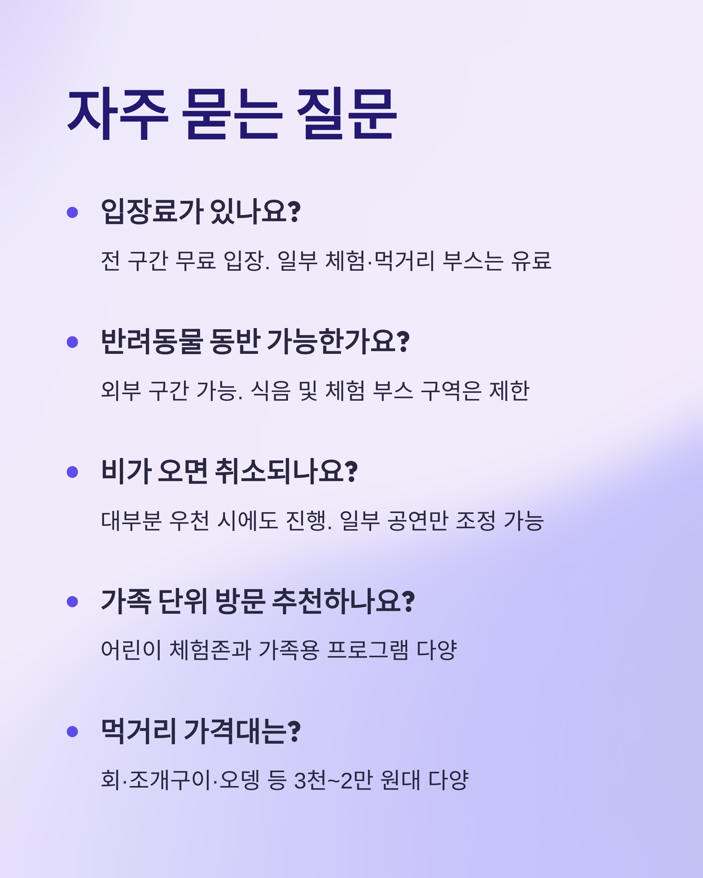 A3. 대부분 프로그램은 우천 시에도 진행되며, 일부 공연만 조정될 수 있습니다.