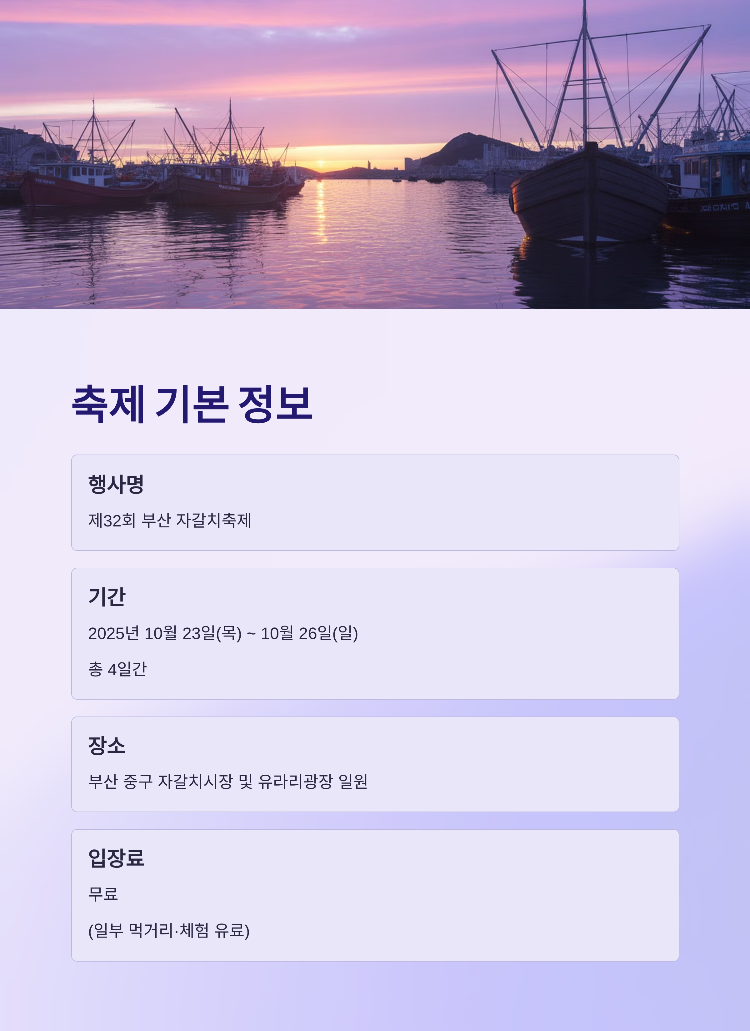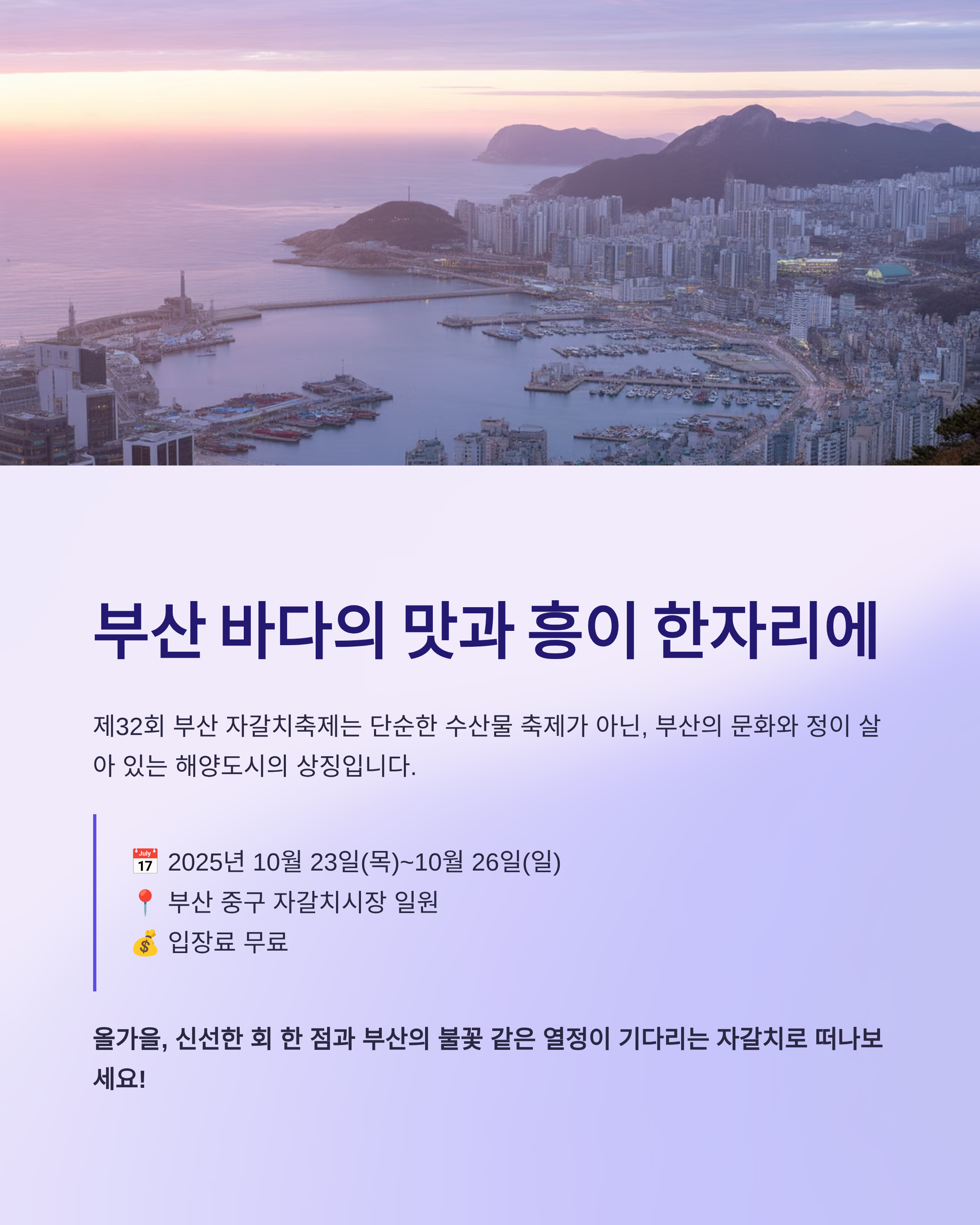 제32회 부산 자갈치 축제는 단순한 수산물 축제가 아닌, 부산의 문화와 정이 살아 있는 해양도시의 상징입니다.