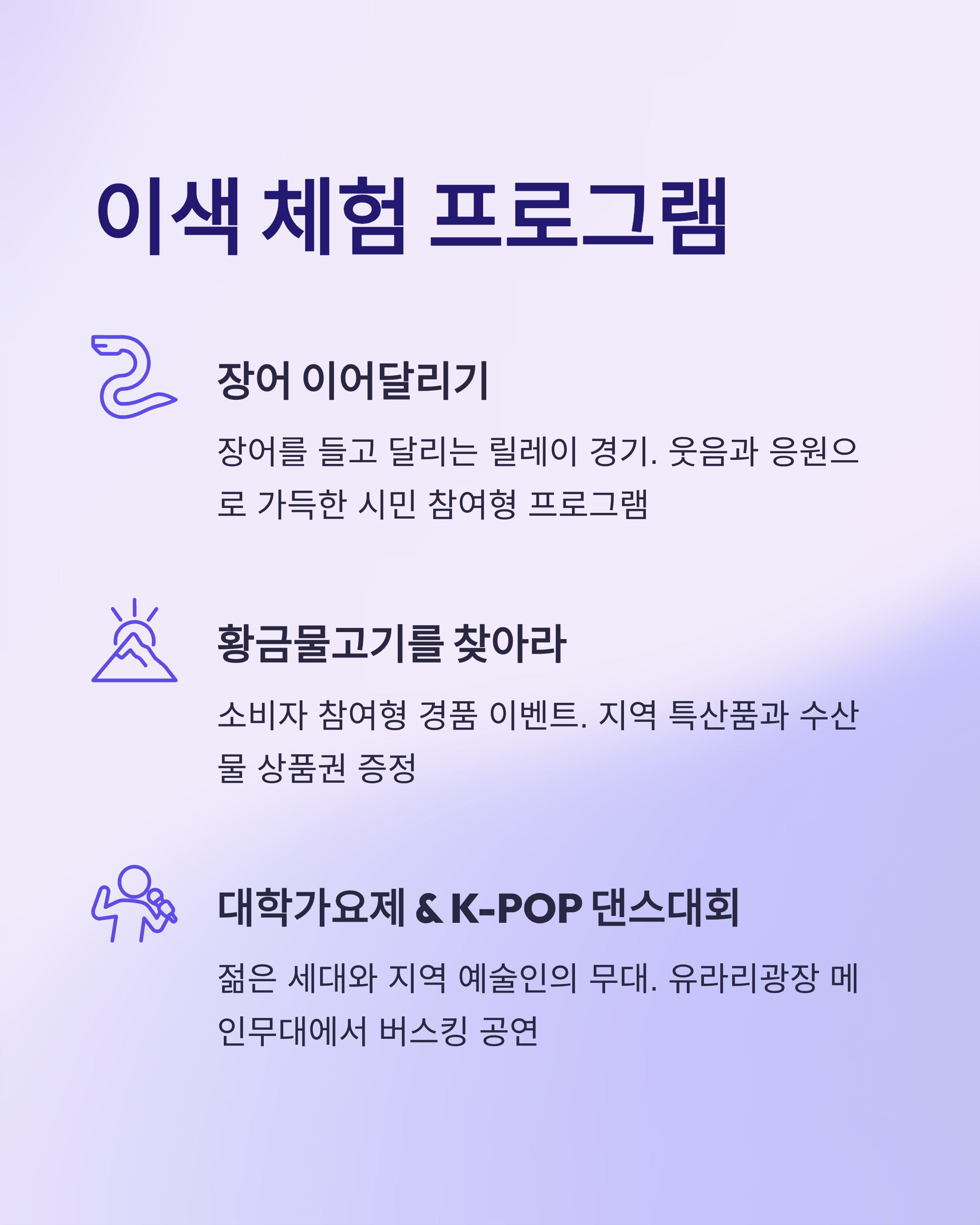 - 플리마켓 & 푸드트럭: 지역 소상공인 먹거리·기념품 판매