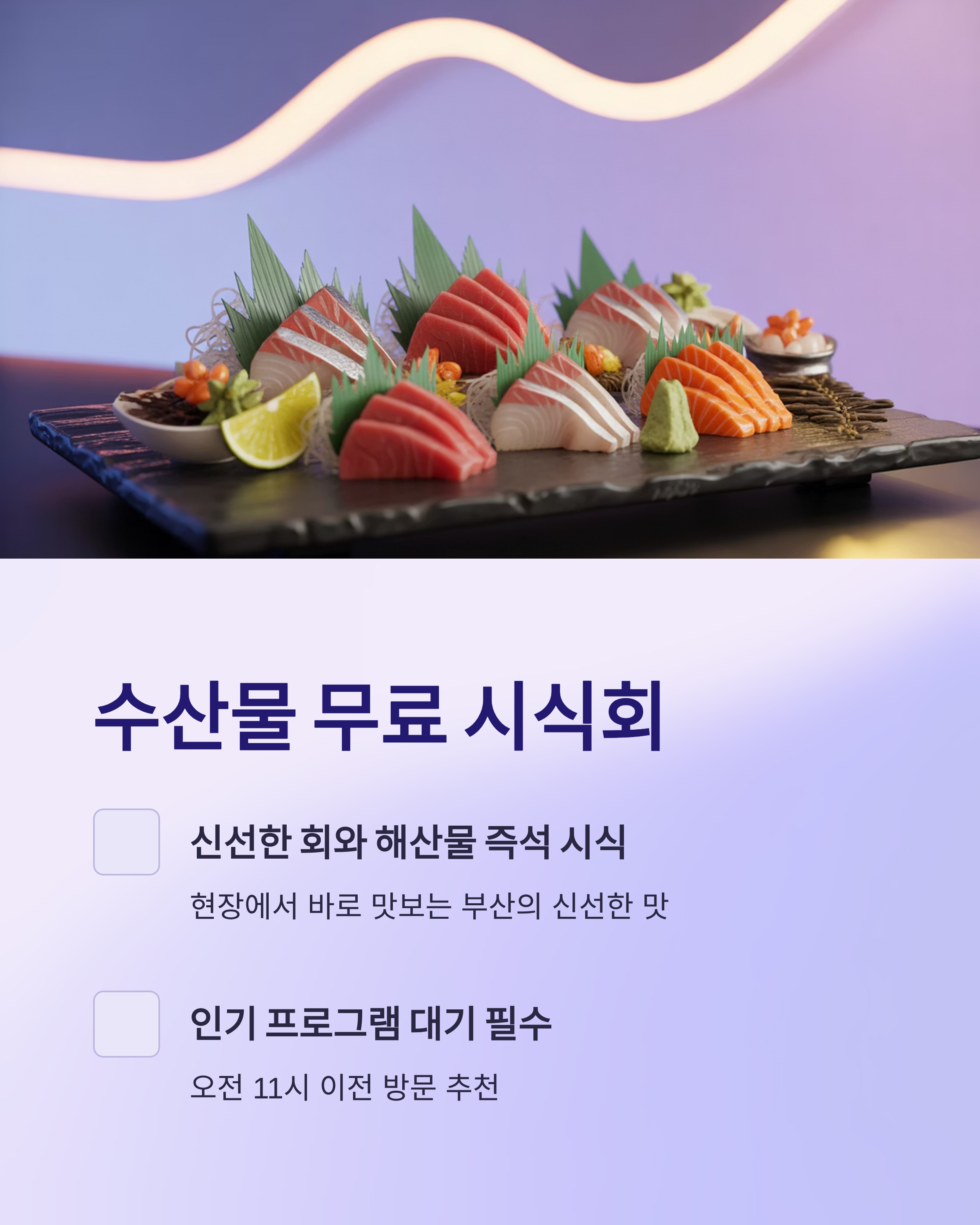 - 내용: 신선한 회와 해산물을 현장에서 즉석 시식