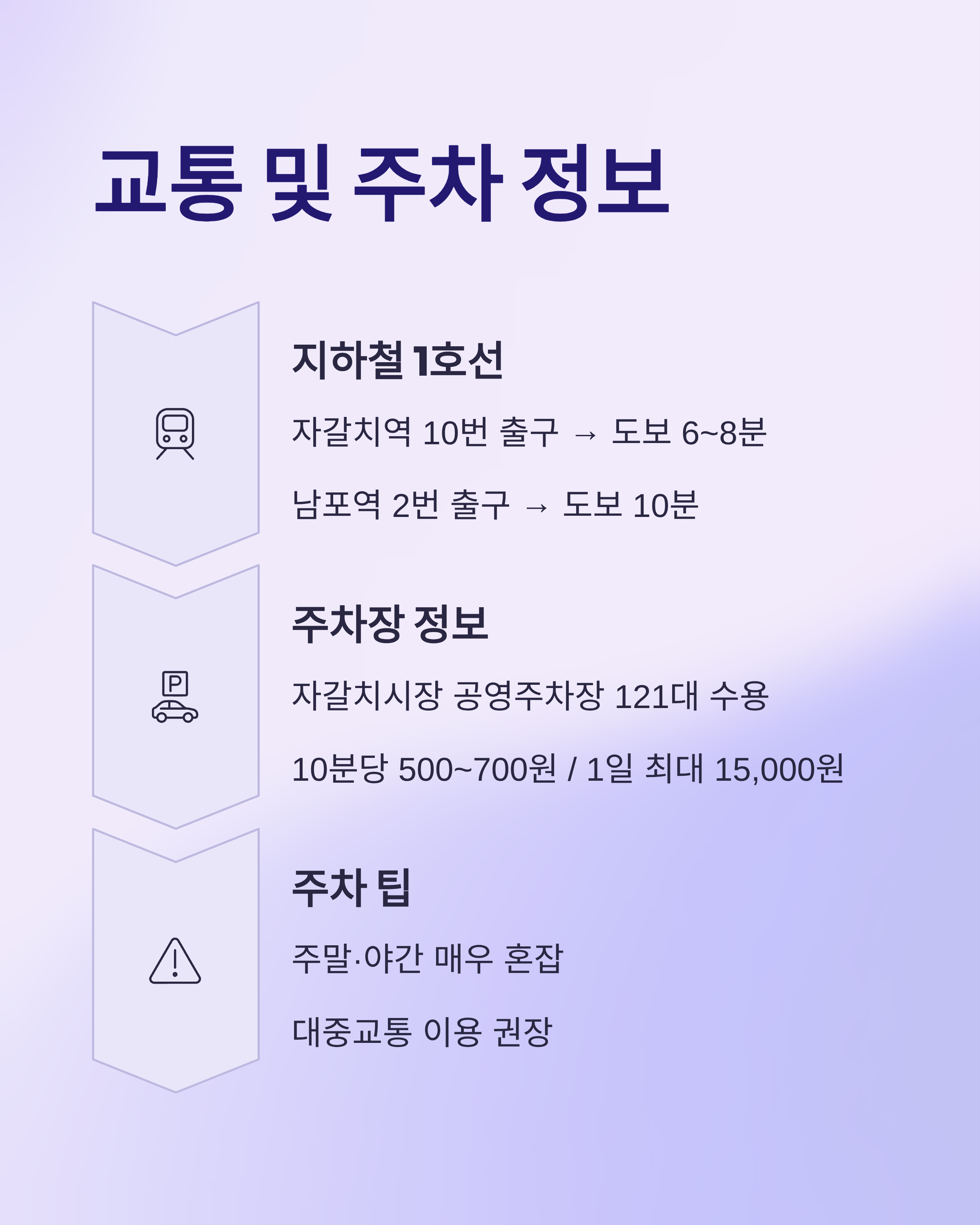 - 팁: 주말·야간에는 매우 혼잡하므로 대중교통 이용 권장