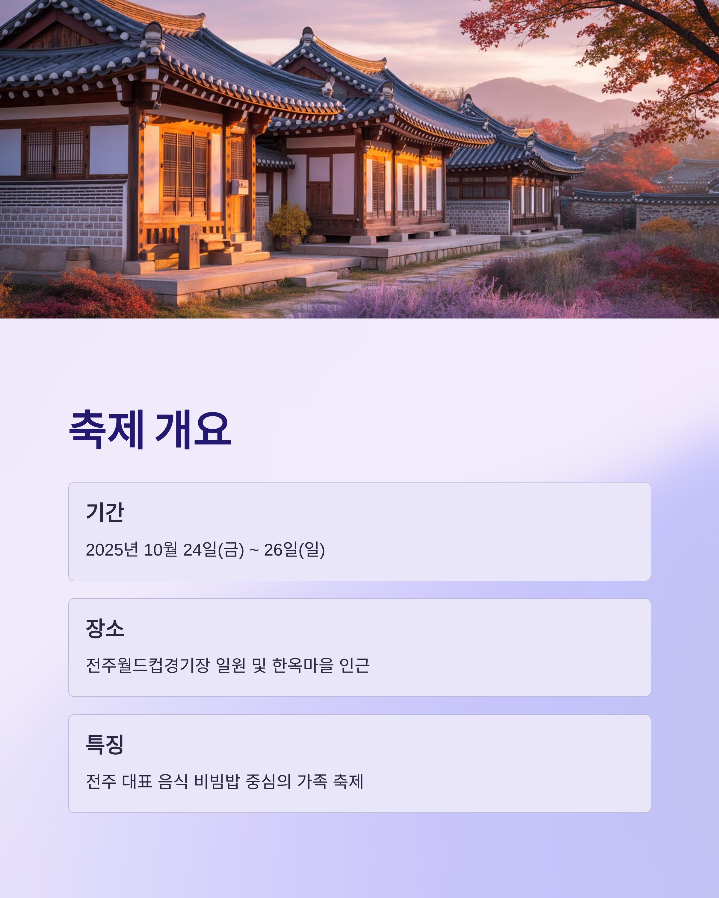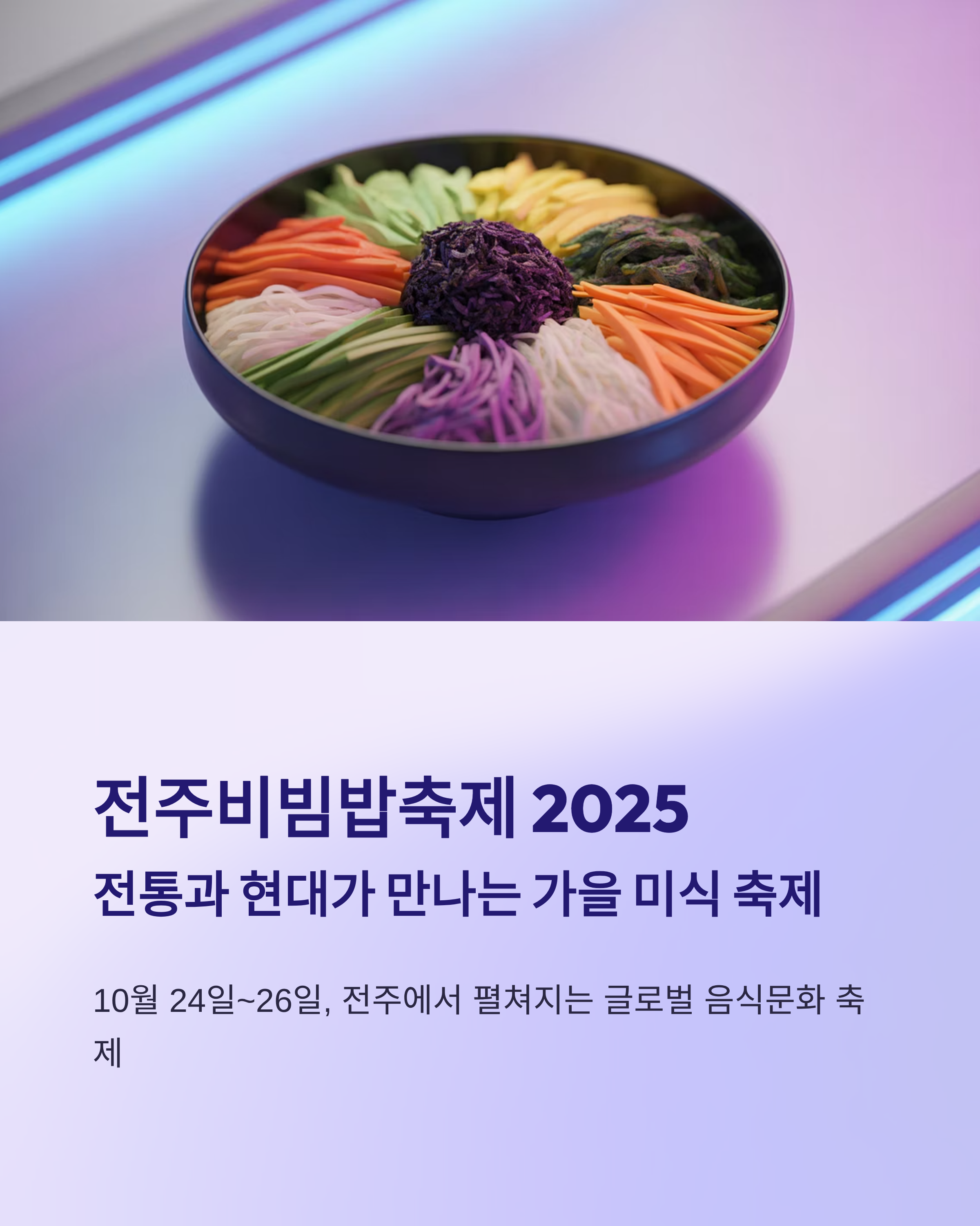 전주의 대표 음식인 비빔밥을 중심으로 펼쳐지는 글로벌 음식문화 축제, 2025 전주비빔밥축제가 10월 24일부터 26일까지 전주월드컵경기장 일원 및 한옥마을 인근에서 개최됩니다. 올해도 다양한 프로그램과 푸짐한 먹거리, 다채로운 공연이 준비되어 있어 온 가족이 함께 즐기기 좋은 가을 대표 축제로 주목받고 있습니다.