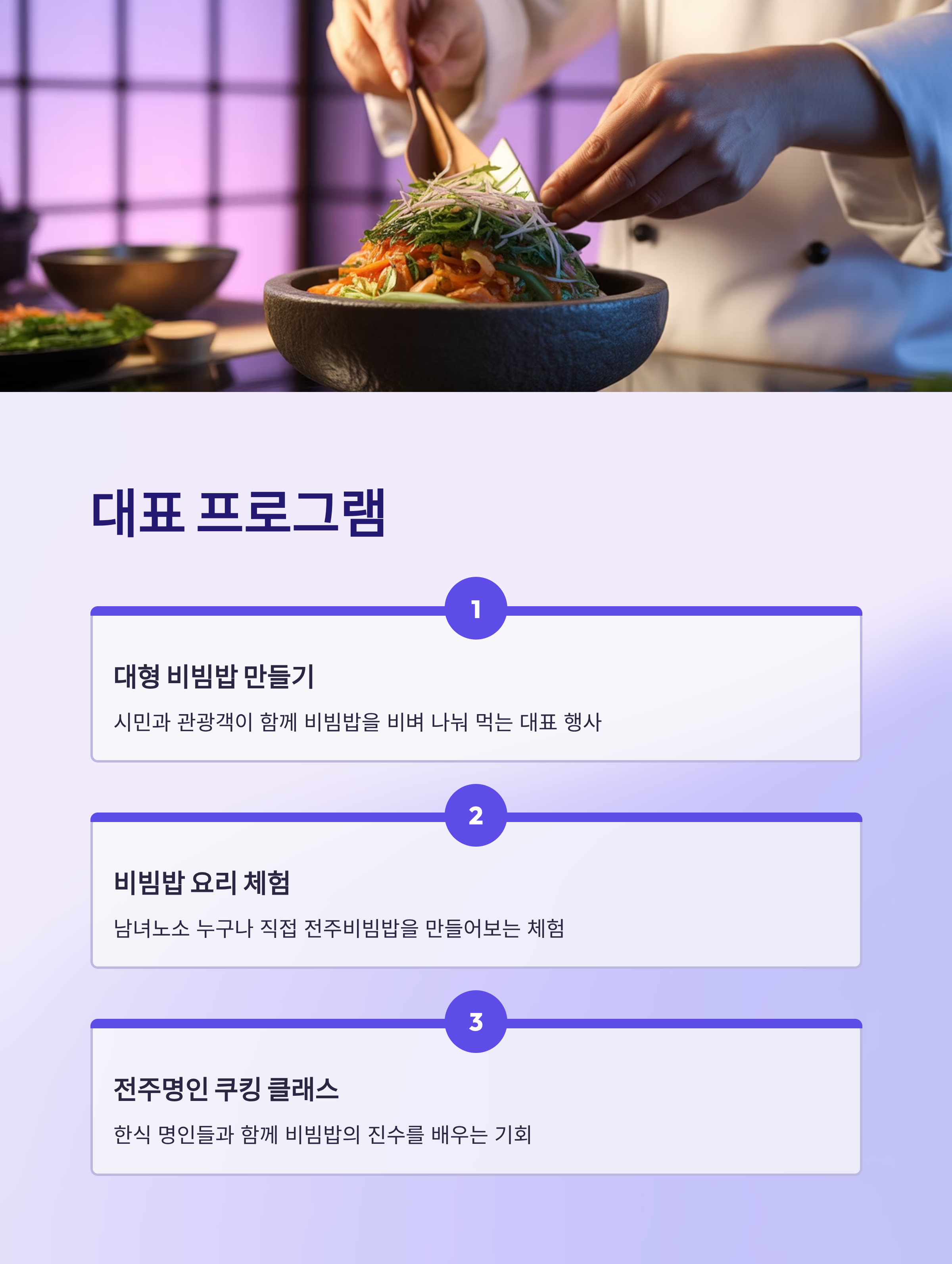전주비빔밥축제는 먹거리뿐 아니라 전통문화와 체험 요소가 결합된 다양한 프로그램으로 구성되어 있습니다.