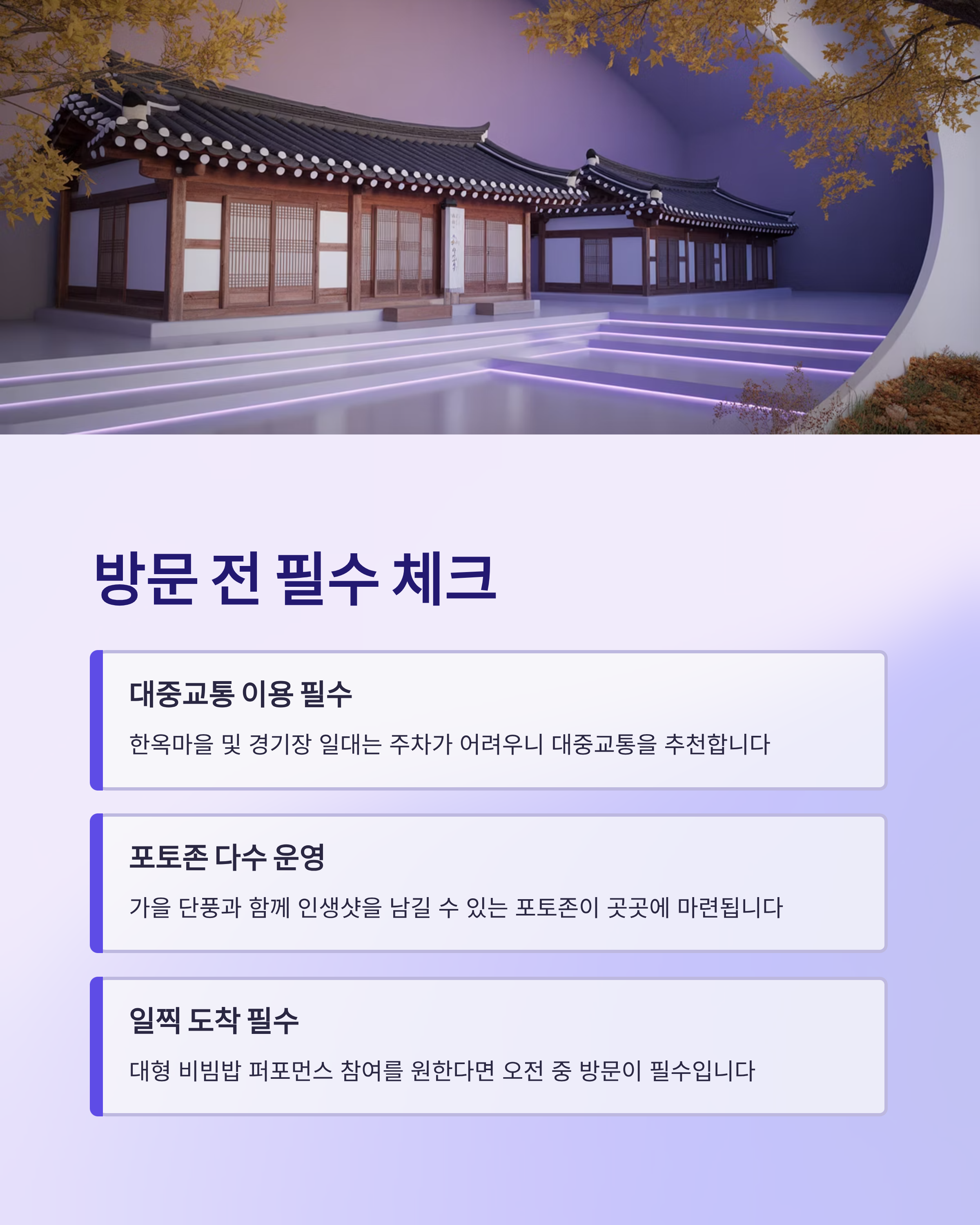 - 일찍 도착 필수: 특히 대형 비빔밥 퍼포먼스 참여를 원한다면 오전 중 방문이 필수입니다.