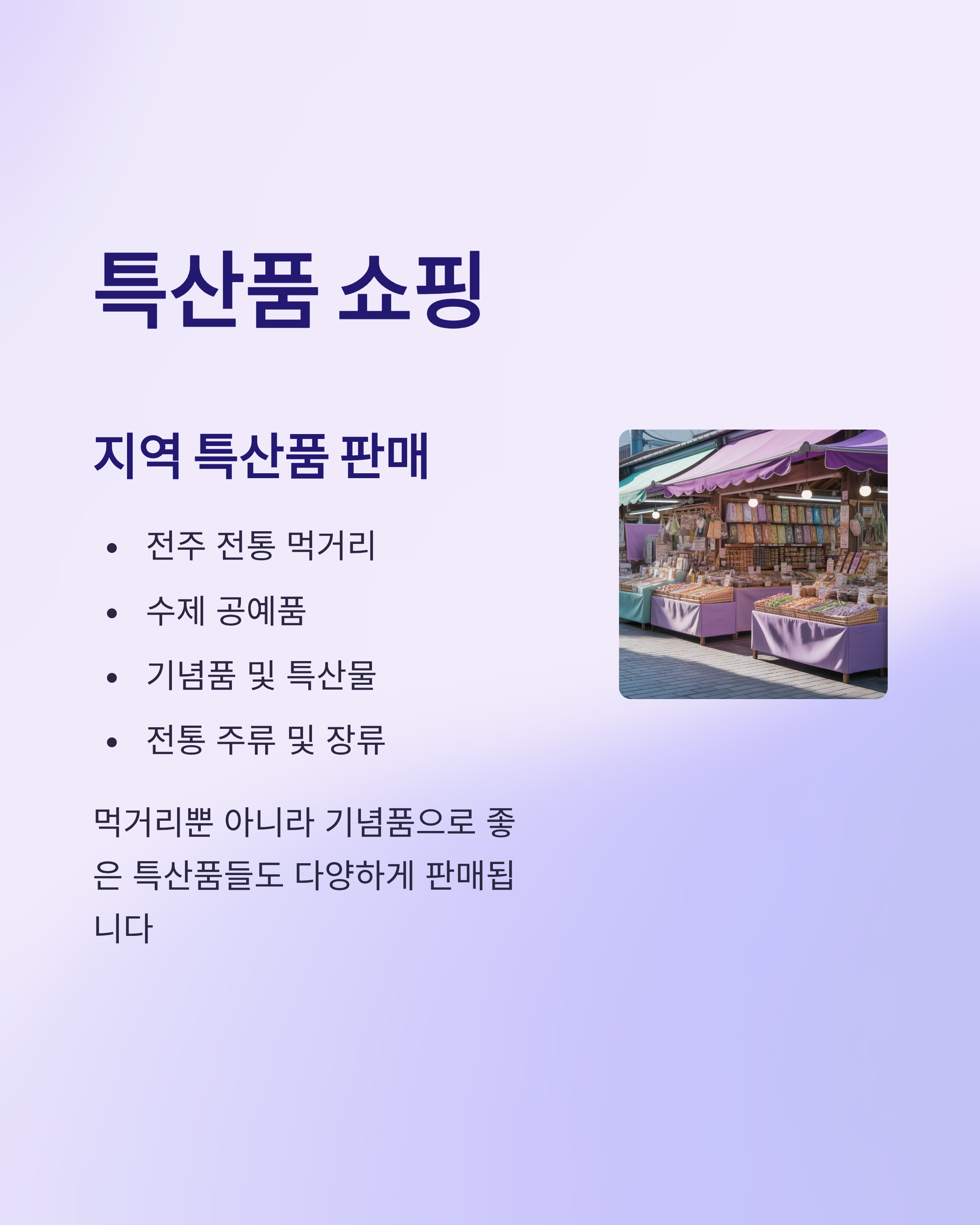 먹거리뿐 아니라 기념품으로 좋은 특산품들도 다양하게 판매되므로 쇼핑의 재미도 함께 누릴 수 있습니다.