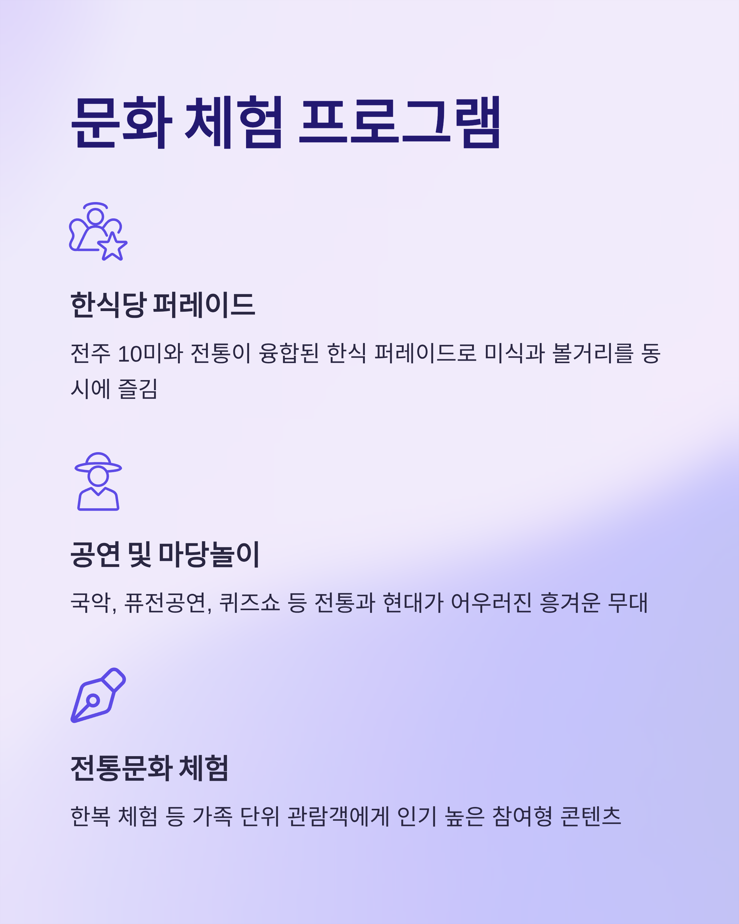 전주 10미와 전통이 융합된 한식 퍼레이드로 미식과 볼거리를 동시에 즐길 수 있습니다. - 공연 및 마당놀이