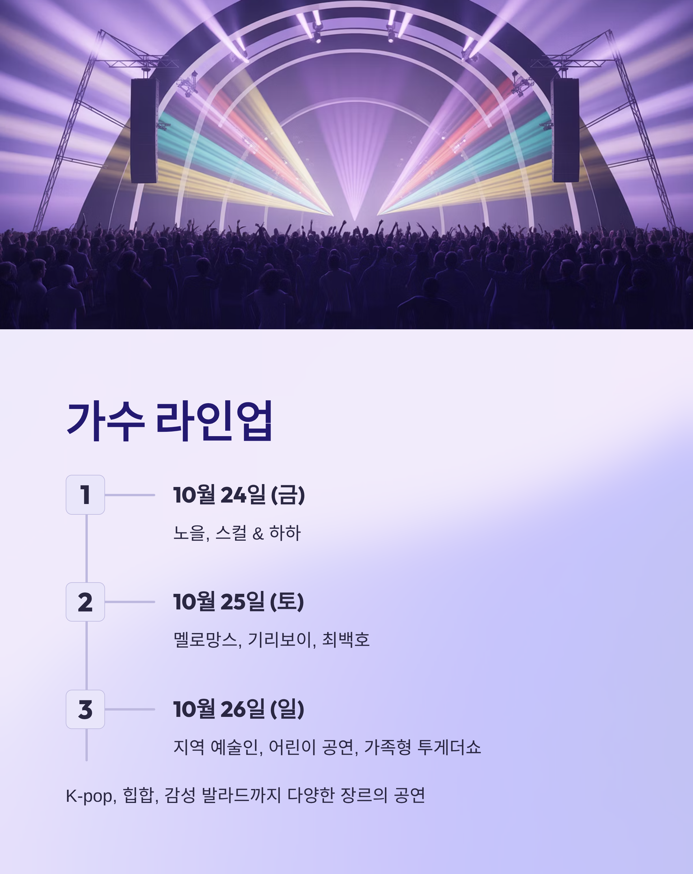 K-pop, 힙합, 감성 발라드까지 아우르는 다양한 장르의 공연이 준비되어 있어 관람객들의 큰 호응이 기대됩니다.