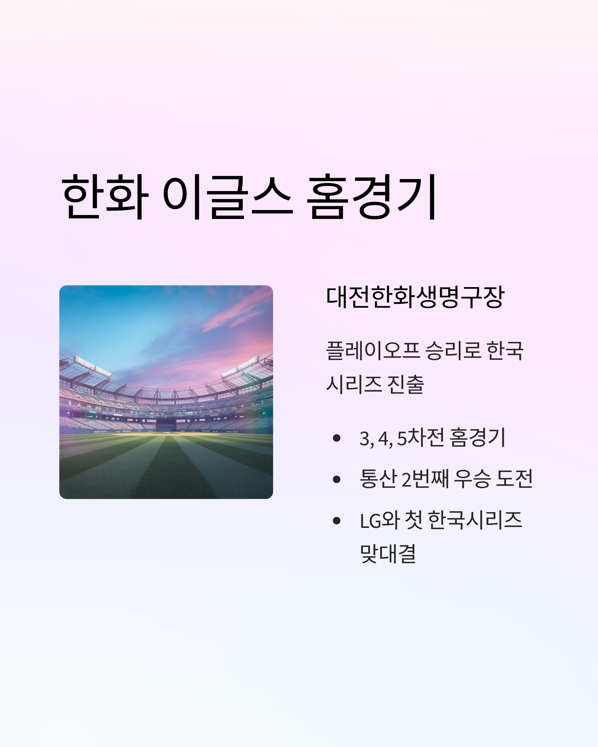 - 한화 이글스(플레이오프 승리팀): 3, 4, 5차전(대전한화생명구장)