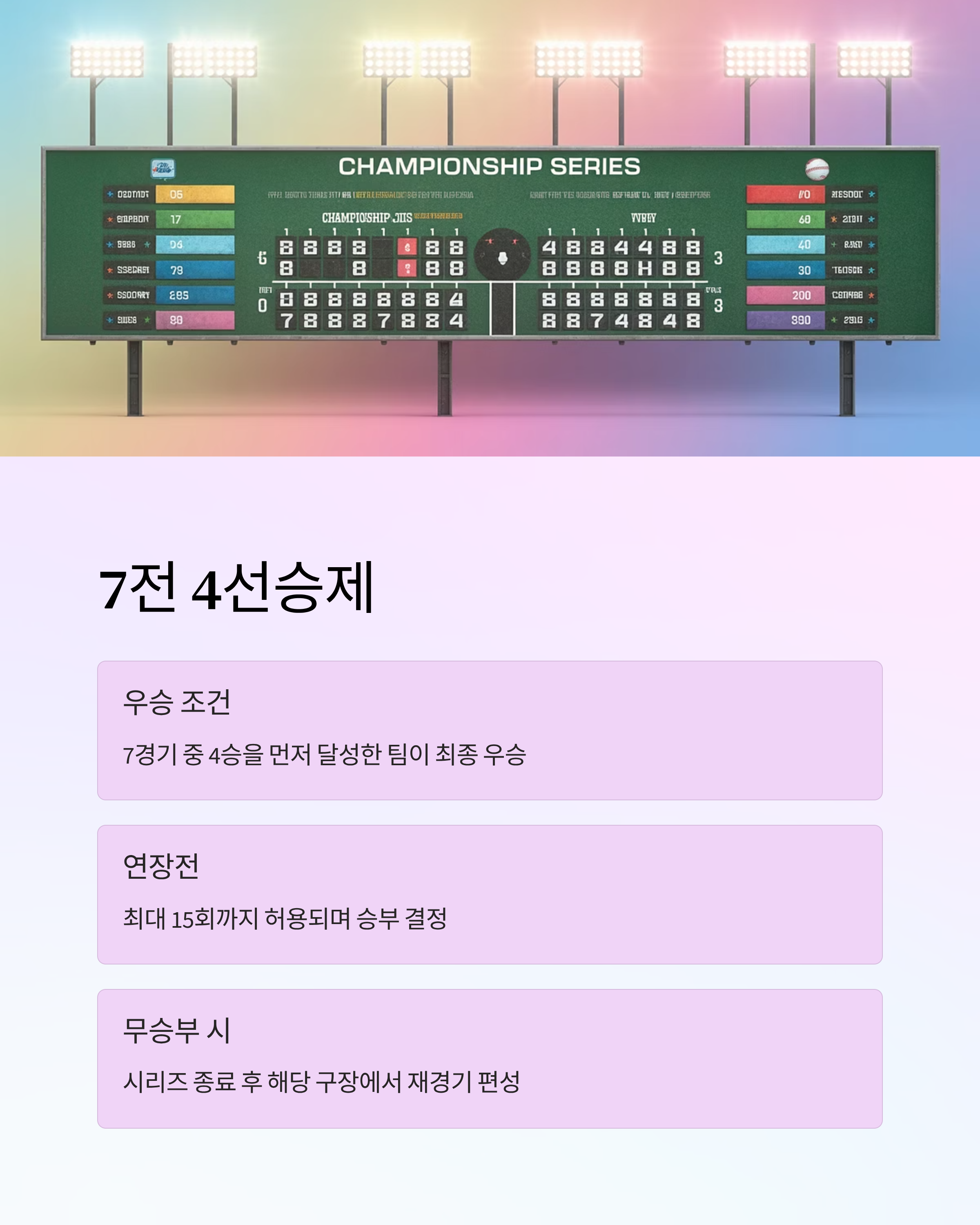 - 무승부 발생 시: 시리즈 종료 후 해당 구장에서 재경기 편성
