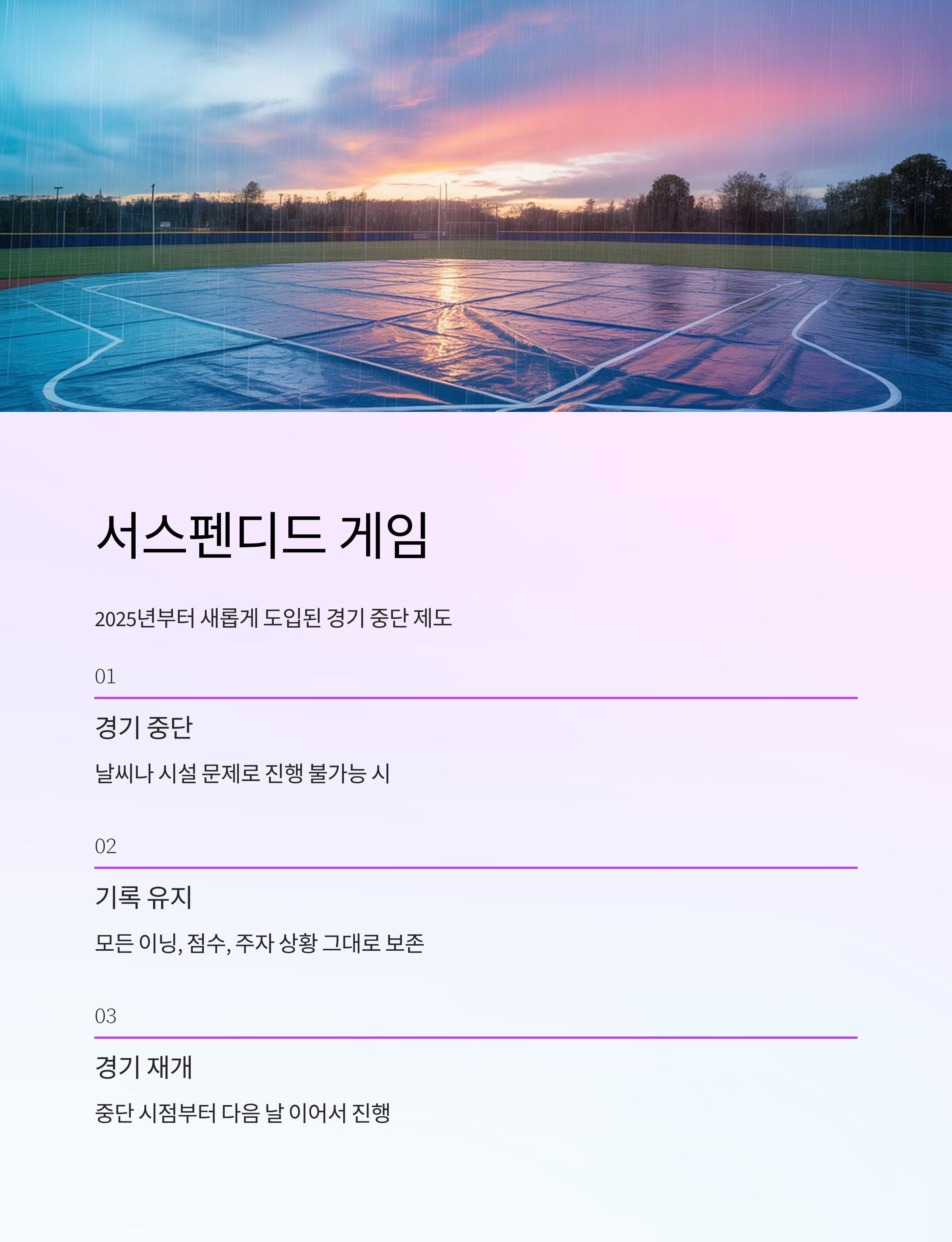- 서스펜디드란: 날씨나 시설 문제 등으로 경기 진행이 불가능할 경우, 기록을 유지한 채 중단 시점부터 다음 날 이어서 진행하는 제도