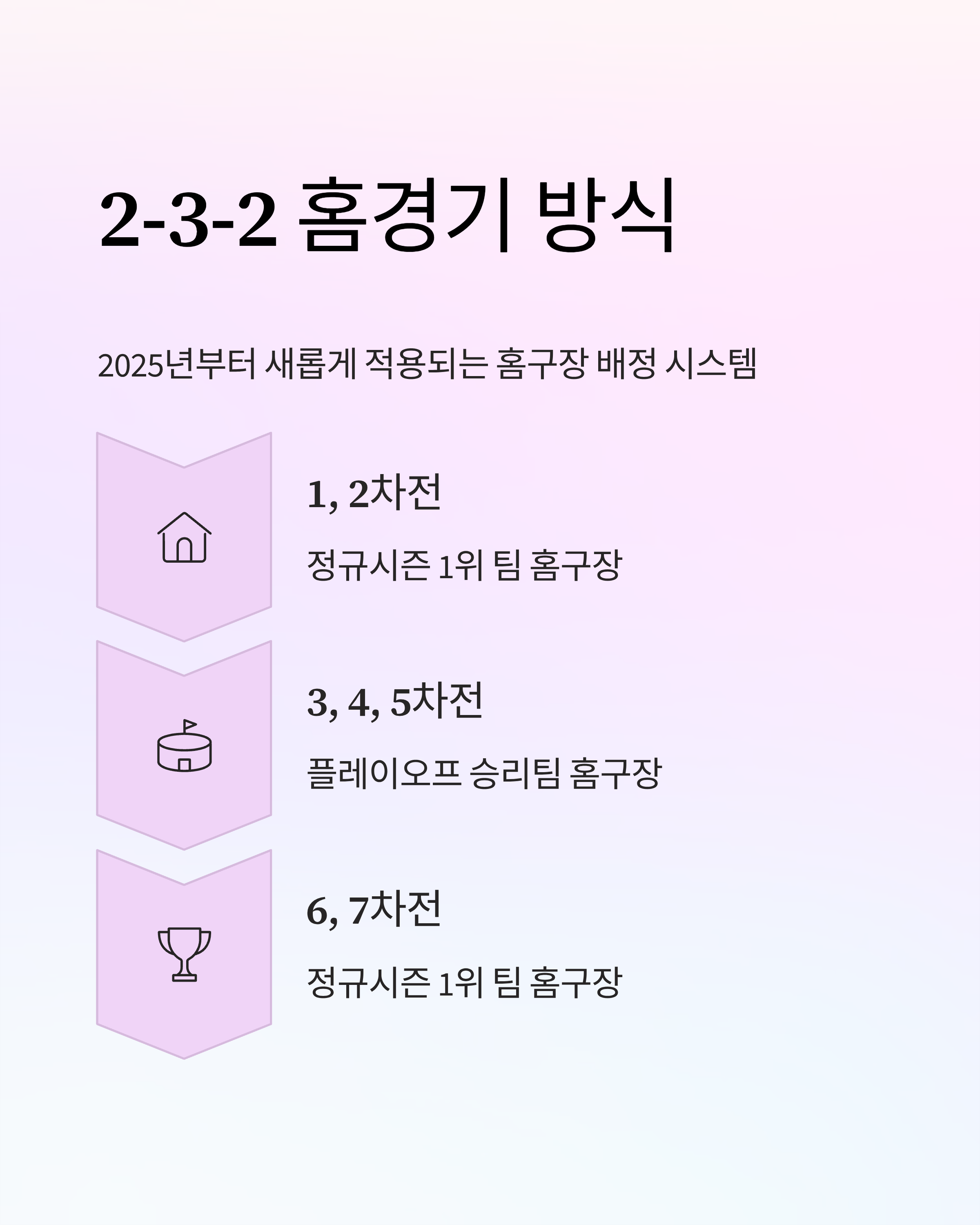 2025년부터 홈구장 배정은 2-3-2 방식으로 변경되었습니다. 이 배치는 홈과 원정의 형평성을 고려한 것으로, 정규시즌 성적 상위팀이 1, 2, 6, 7차전 홈경기를 갖습니다.