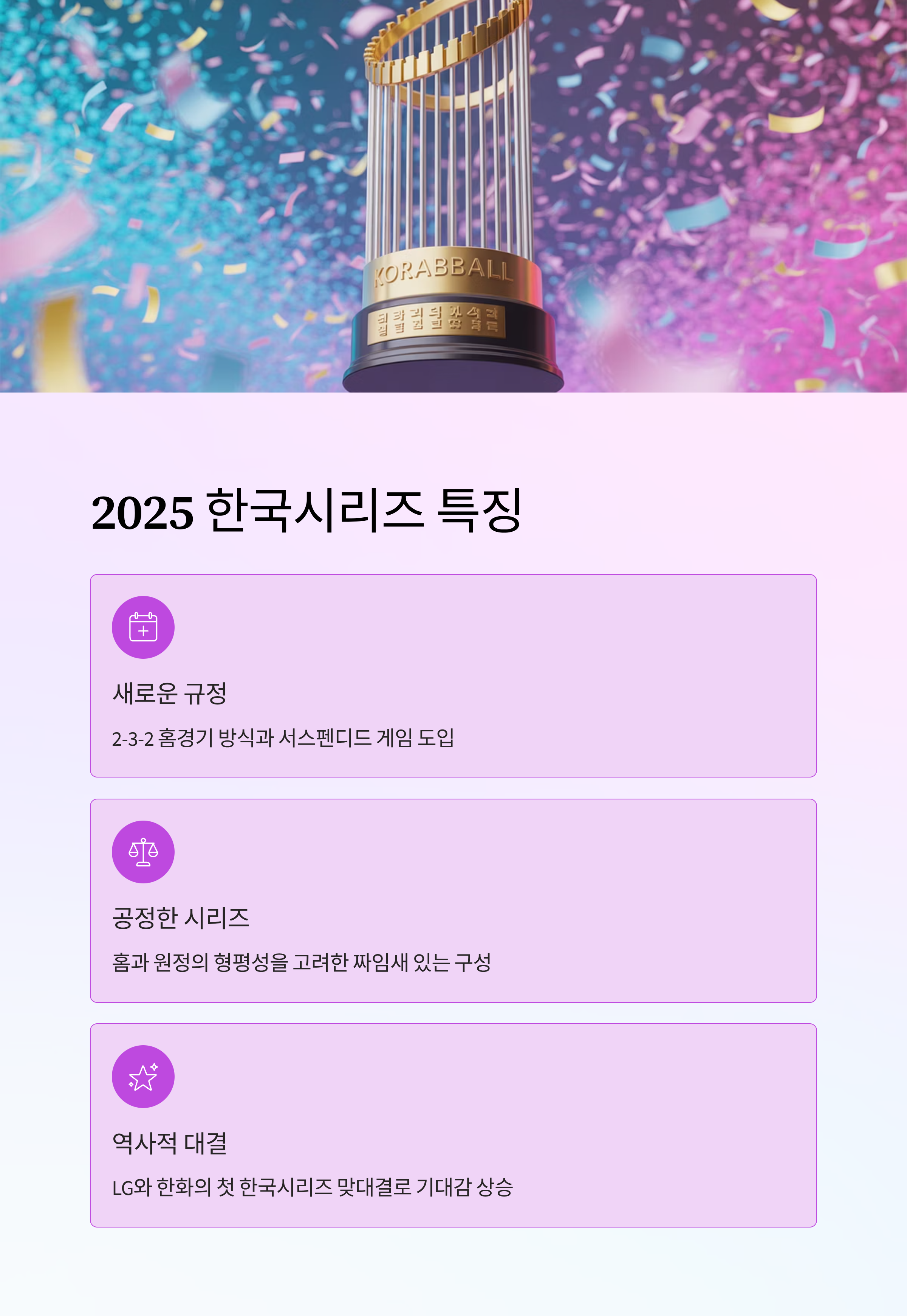 2025 KBO 한국시리즈가 LG 트윈스와 한화 이글스의 맞대결로 펼쳐집니다. 특히 올해부터 적용되는 2-3-2 홈경기 방식과 서스펜디드 규정이 적용되면서 포스트시즌 경기 이해를 돕기 위한 정보가 중요해졌습니다. 이 글에서는 한국시리즈의 경기방식, 일정, 규정 변화 등을 한눈에 확인할 수 있도록 정리했습니다.