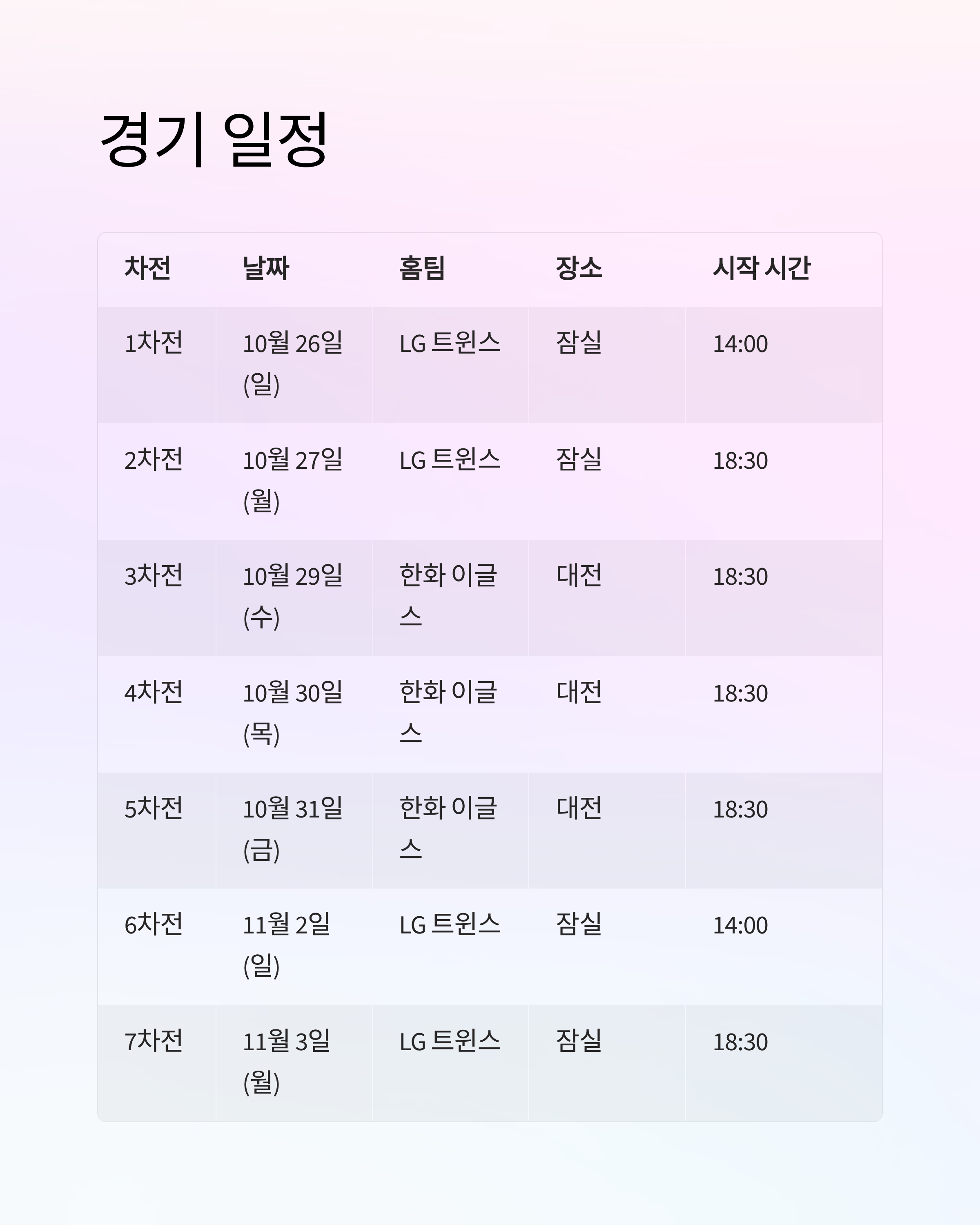 | 7차전 | 11월 3일(월) | LG 트윈스 | 한화 이글스 | 잠실 | 18:30 |