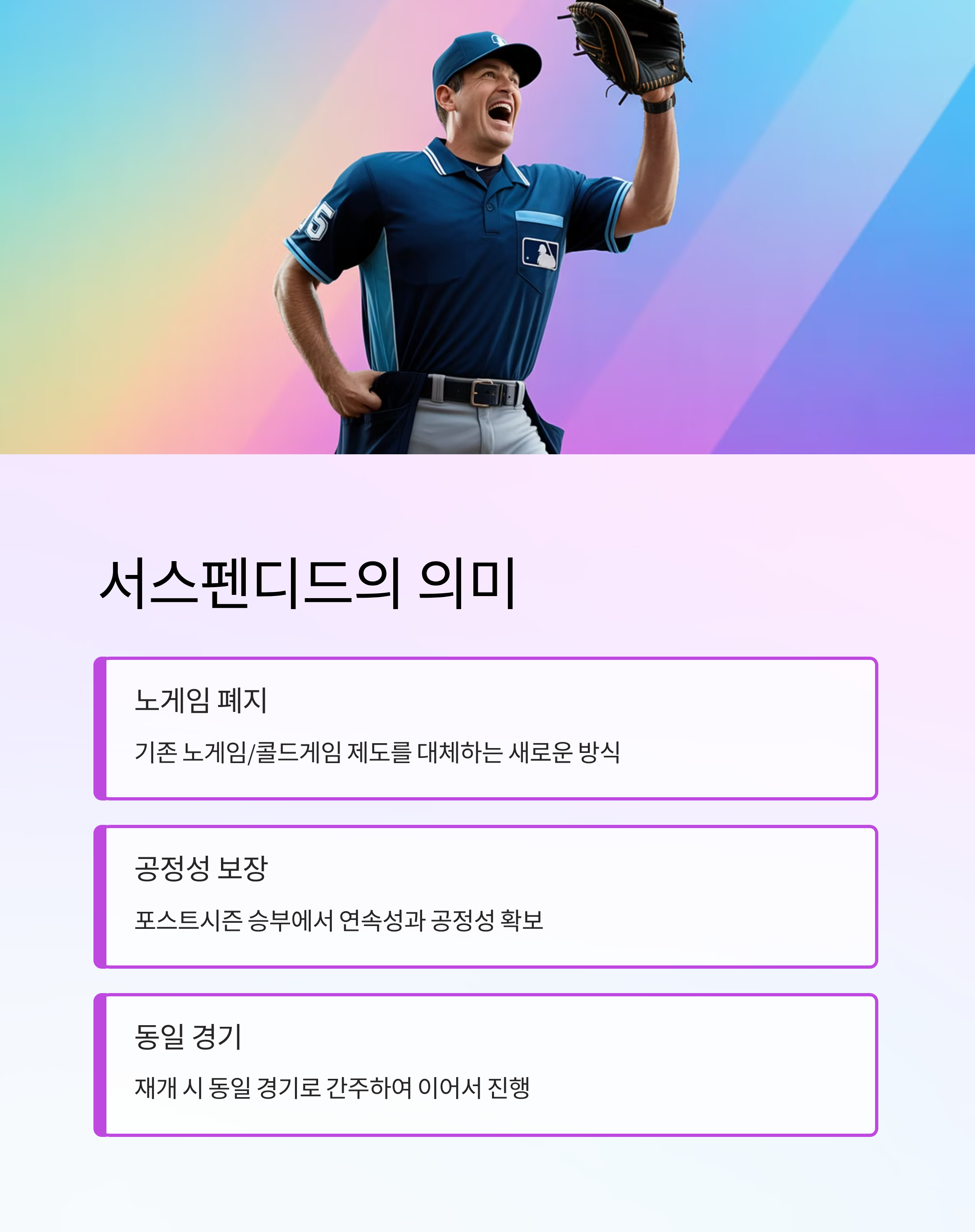 이 방식은 포스트시즌처럼 승부가 반드시 나야 하는 경기에서 공정성과 연속성을 보장하기 위한 제도입니다.