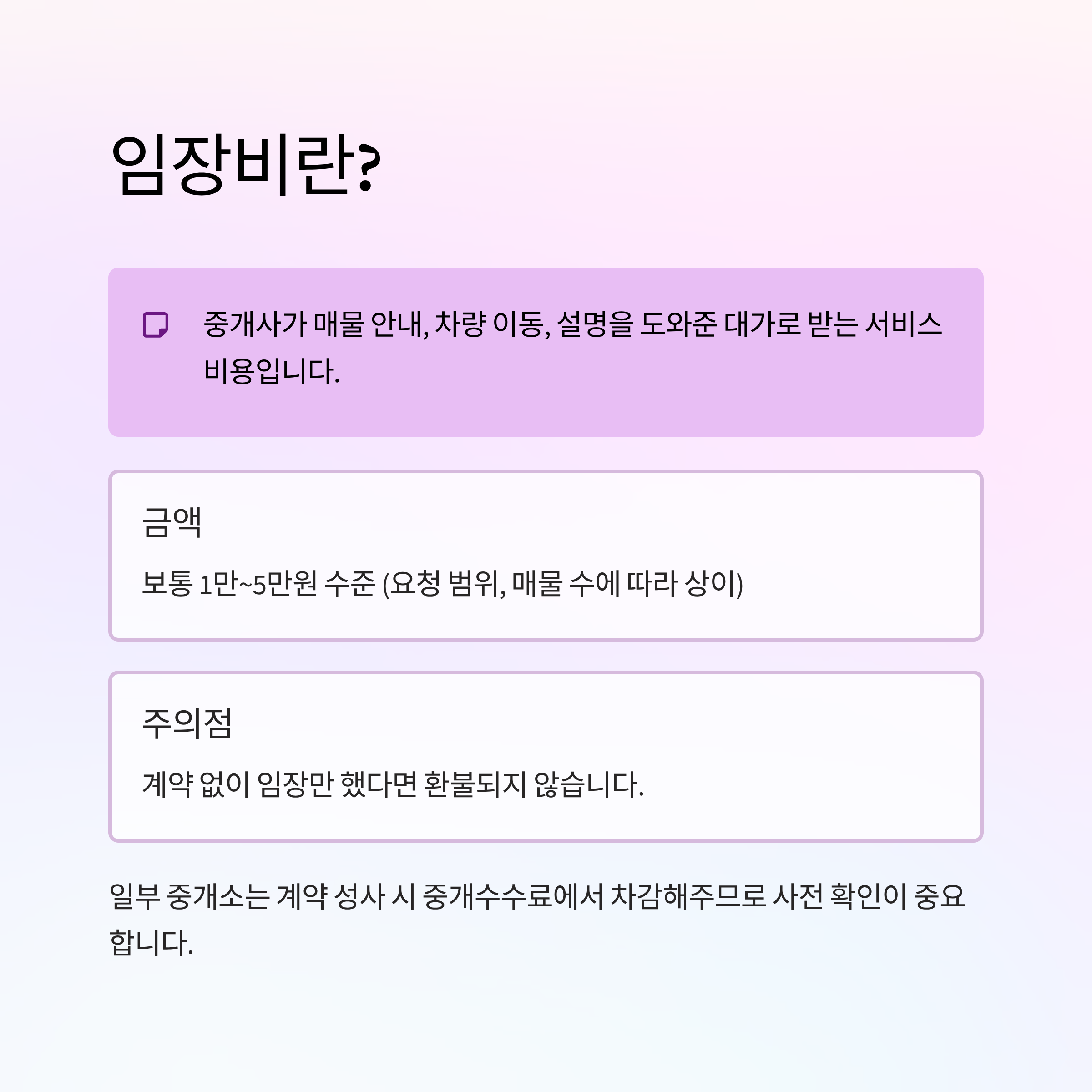 - 임장비란?: 중개사가 매물 안내, 차량 이동, 설명을 도와준 대가로 받는 서비스 비용