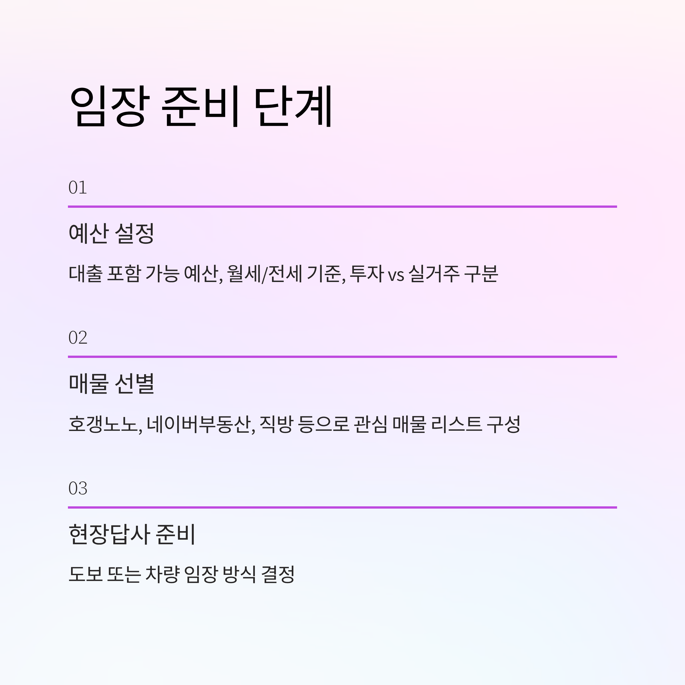 제대로 된 임장을 하기 위해서는 체계적인 준비가 필요합니다. 다음은 임장 전~후로 꼭 체크해야 할 단계입니다.
