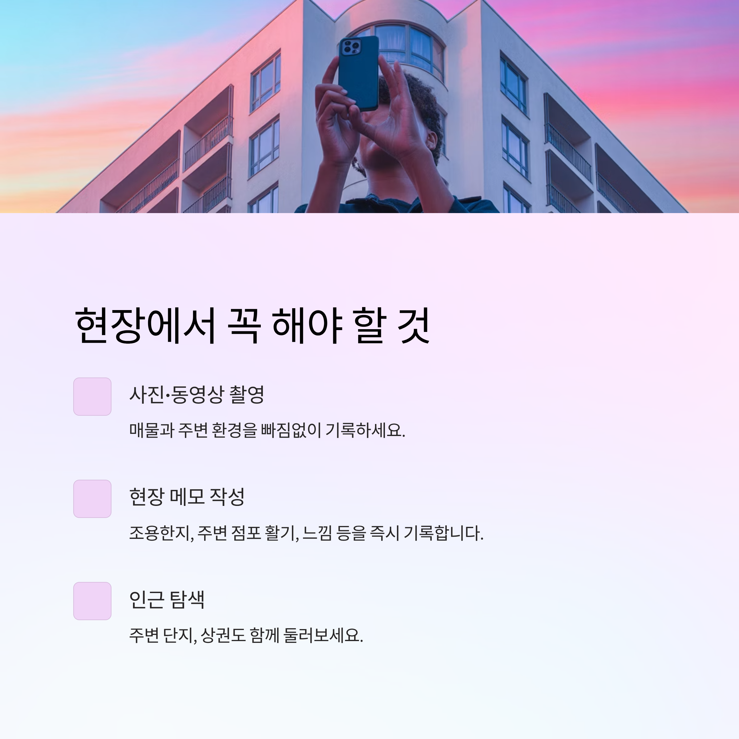 잘 준비된 임장은 수천만 원의 실수와 후회를 막아줍니다.