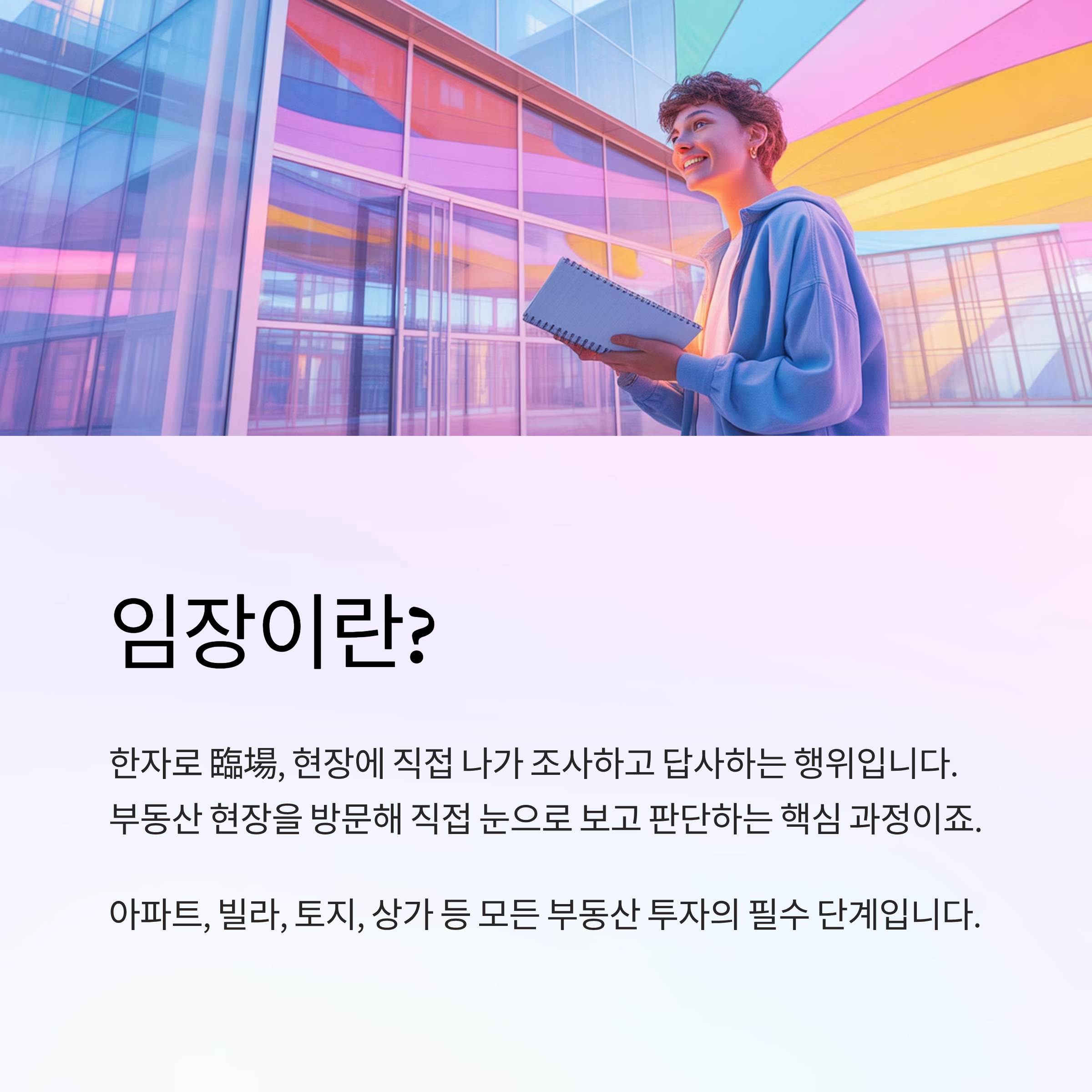 ‘임장(臨場)’은 부동산 투자와 매매의 첫걸음이자, 가장 확실한 정보 수집 방법입니다. 책상 앞에서 보는 정보만으로는 절대 파악할 수 없는 실질적인 정보들이 현장에는 모두 있습니다.