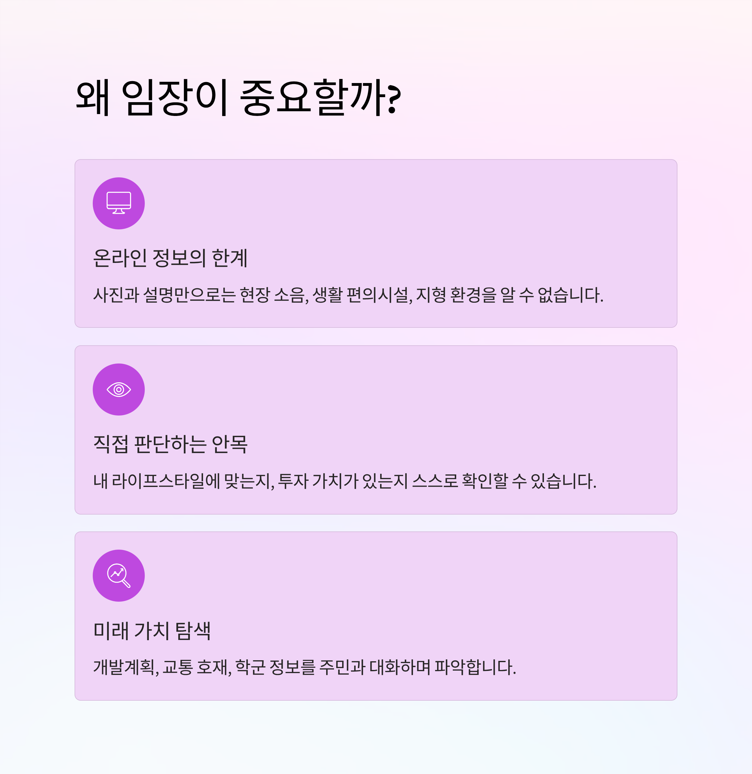 단순히 집을 보기 위한 방문이 아니라, 임장은 수천만 원에서 수억 원에 이르는 부동산 거래의 리스크를 줄이는 실질적인 행위입니다.