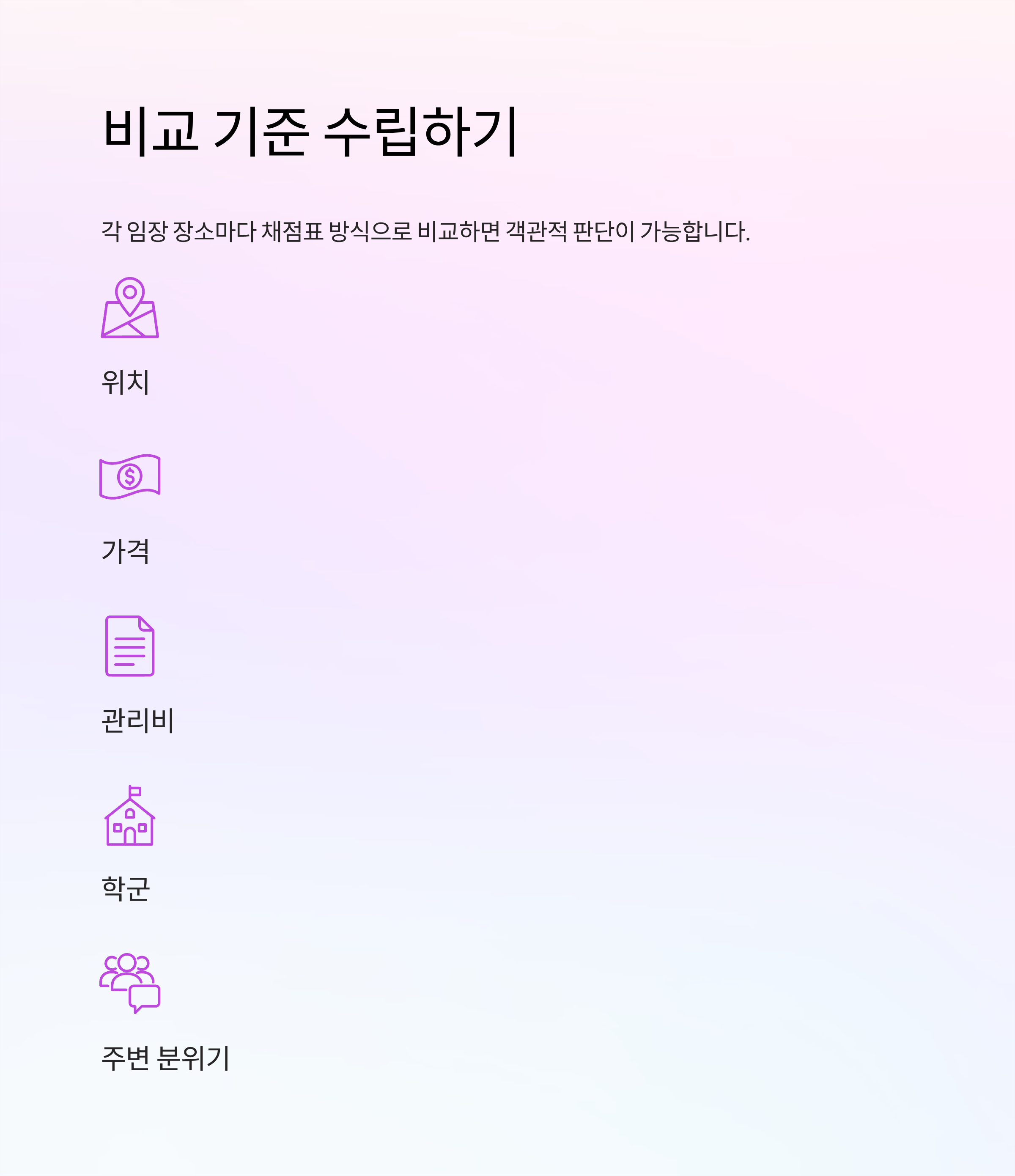 - 위치/가격/관리비/학군/주변 분위기 등 기준 항목 정하고