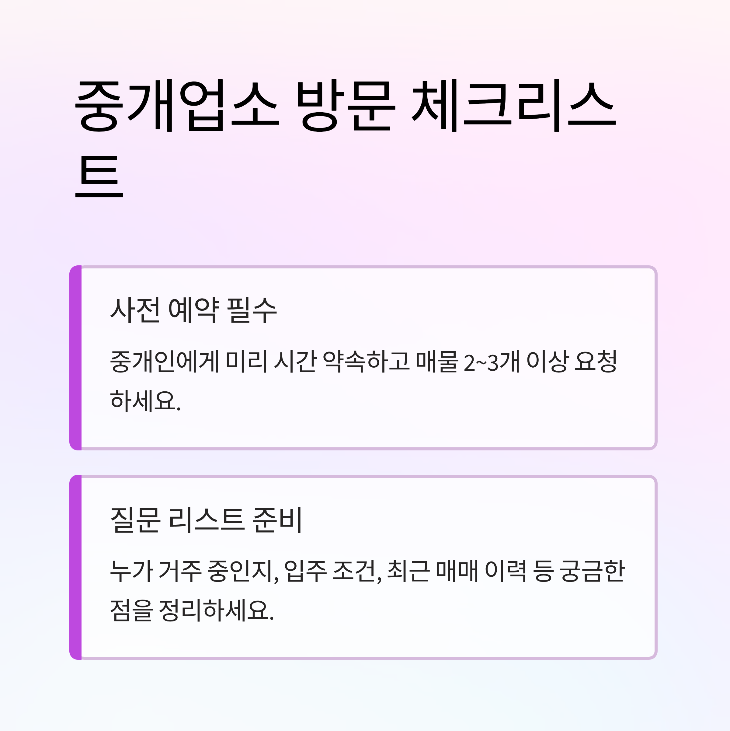 - 반드시 궁금한 질문 리스트 준비 (누가 거주 중인지, 입주 조건, 최근 매매 이력 등)