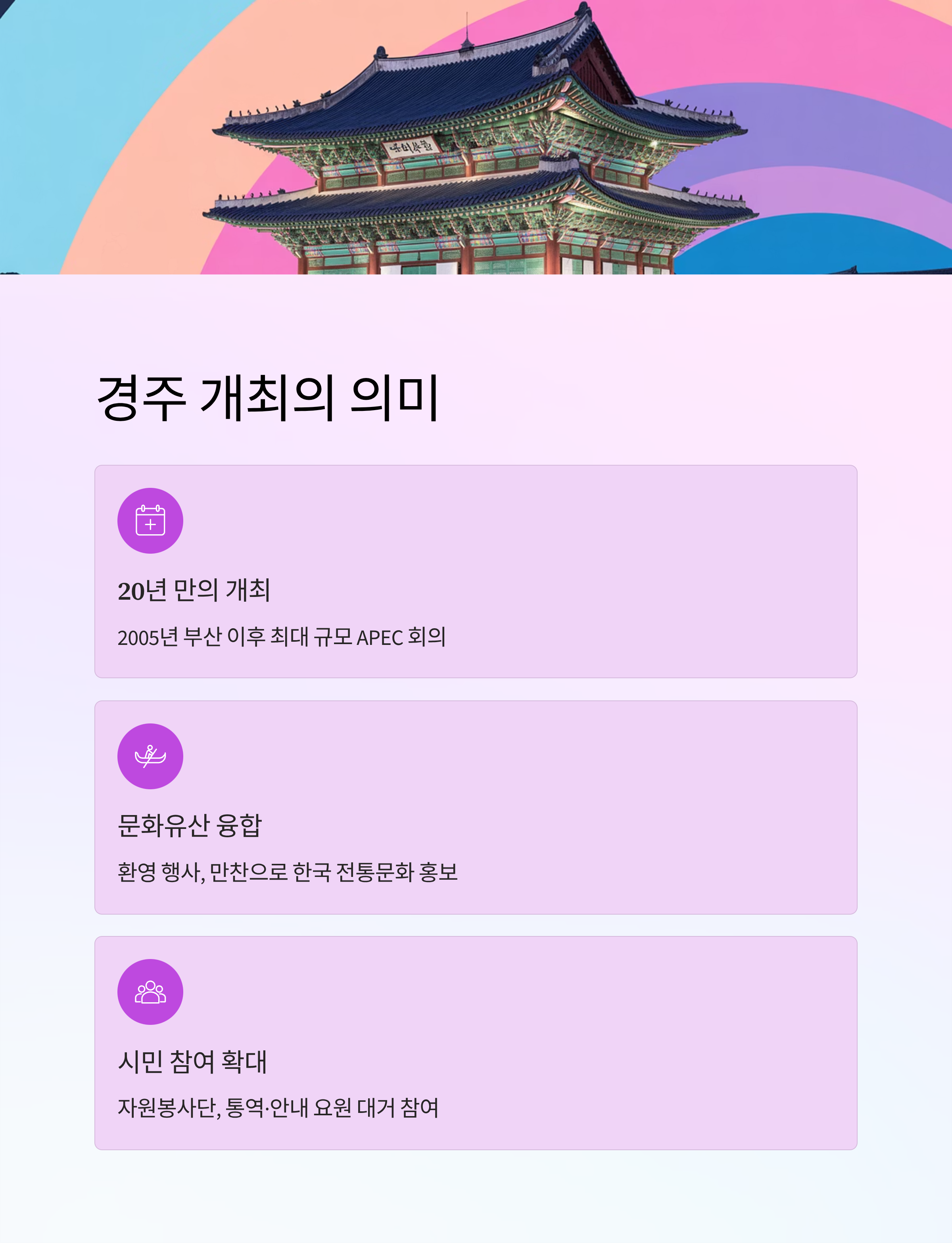 - 20년 만의 국내 APEC 개최: 2005년 부산 이후 최대 규모