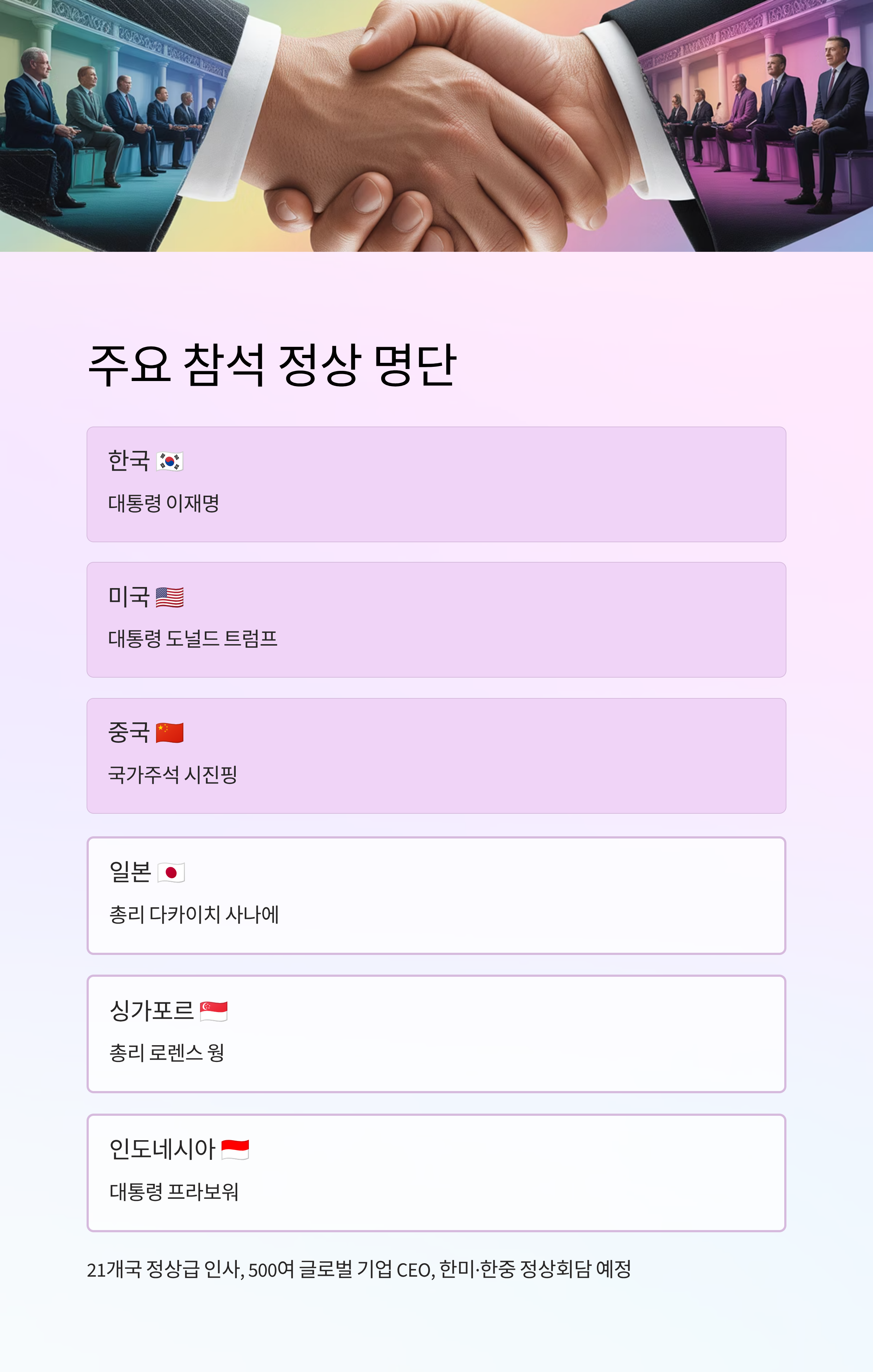 총 21개국 정상급 인사와 대표단, 각국 경제계 리더 및 500여 개 글로벌 기업의 CEO, 국제기구 고위급 인사들이 함께하며, 한미·한중·미중 정상회담 등 개별 회담도 다수 예정돼 있습니다.