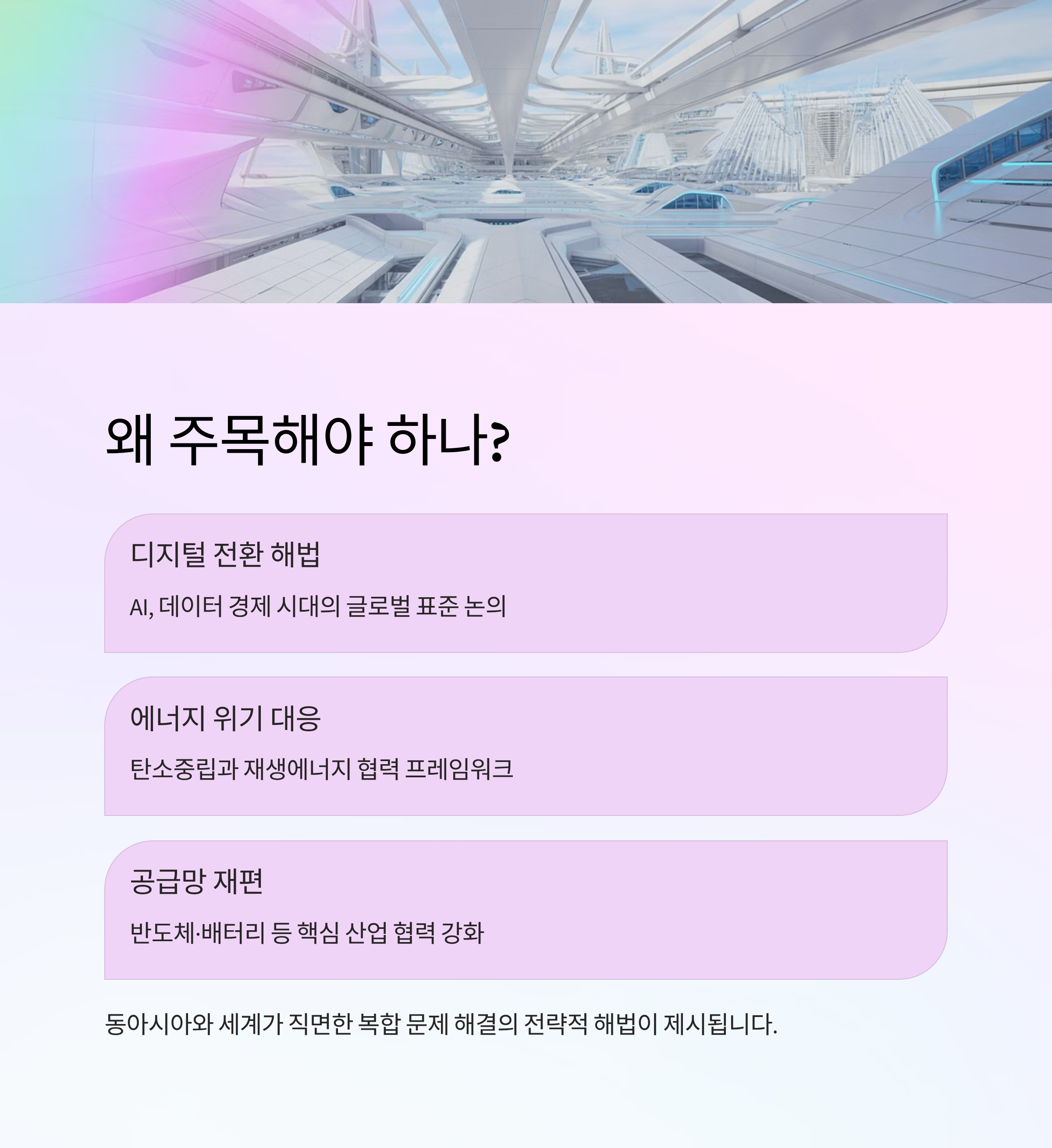 2025 경주 APEC 정상회의는 단순한 외교 행사 그 이상입니다. 디지털 전환, 에너지 위기, 인구 변화, 공급망 재편 등 동아시아와 세계가 직면한 복합 문제를 해결하기 위한 전략적 해법이 제시되는 자리입니다.