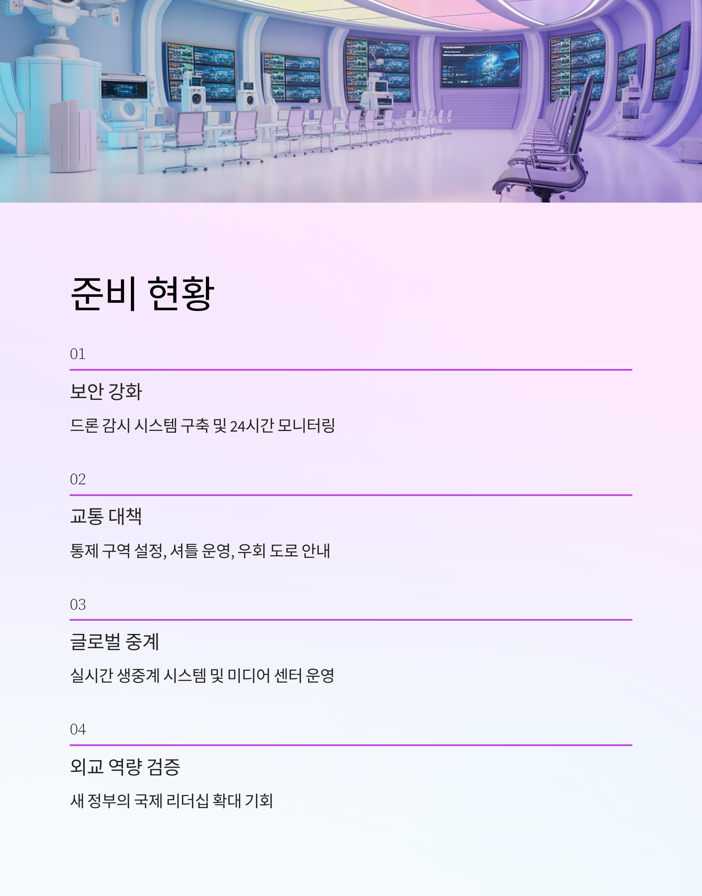 - 보안 및 교통대책 강화: 드론 감시, 교통 통제, 글로벌 생중계 시스템 구축