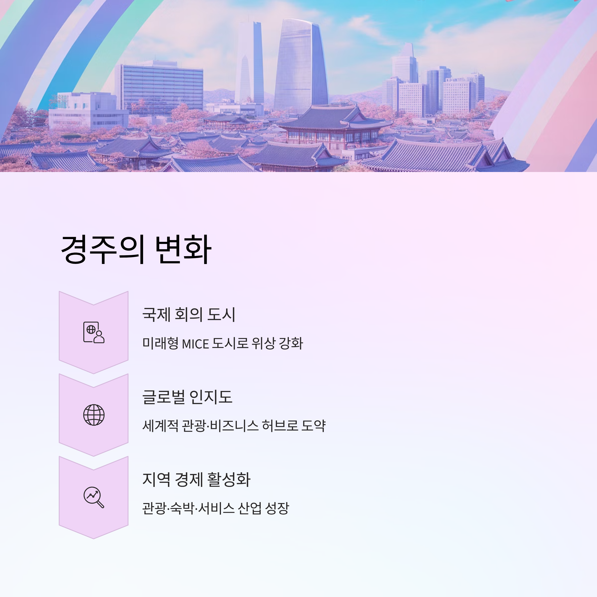 - 경주 문화유산과의 융합: 환영 행사, 만찬, 문화 체험 등으로 한국의 전통문화 홍보