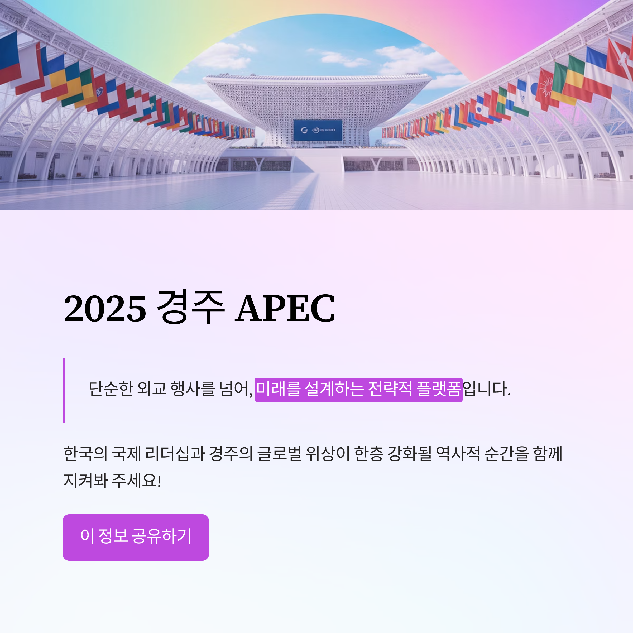 이번 회의를 통해 대한민국, 특히 경주는 미래형 국제 회의 도시로서의 위상을 한층 강화하게 될 것입니다. 향후 한국 경제, 외교, 첨단산업 협력 방향에도 큰 영향을 미칠 이 정상회의에 주목해 보시기 바랍니다.