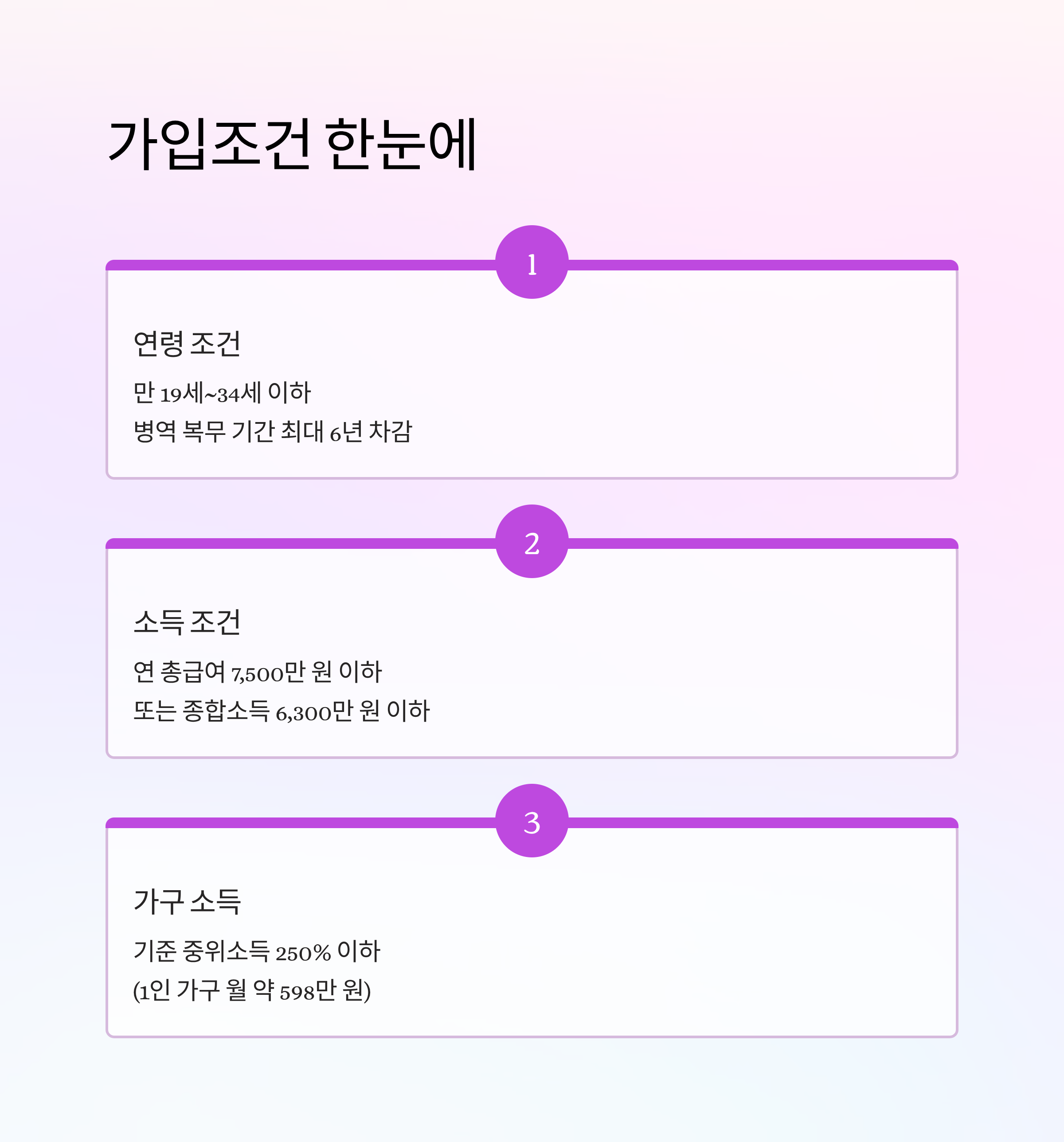 - 가입 대상: 만 19~34세 청년 (병역 이행자 최대 6년 차감 가능)