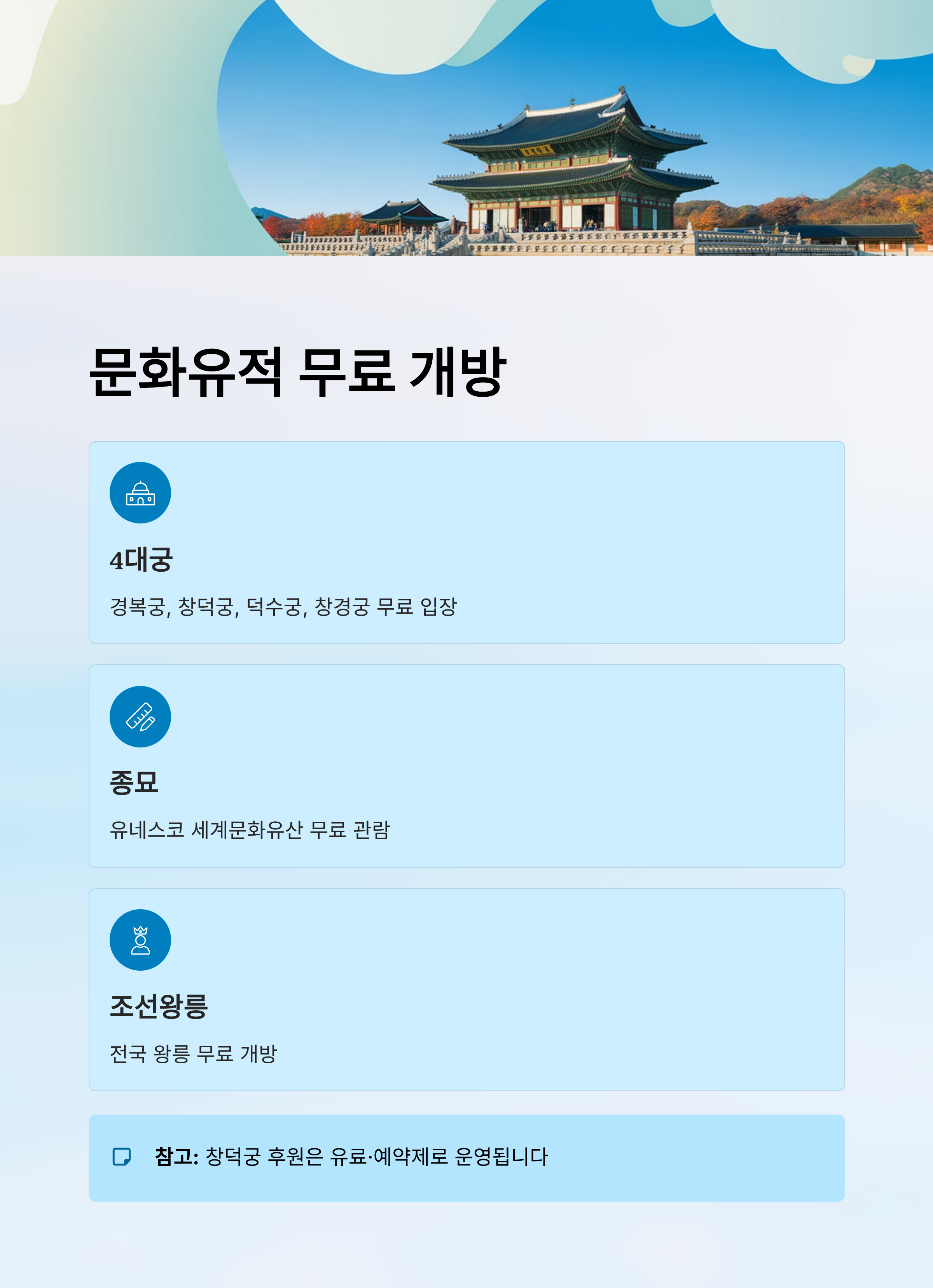 - 4대궁(경복궁, 창덕궁, 덕수궁, 창경궁) 및 종묘, 조선왕릉 무료 개방