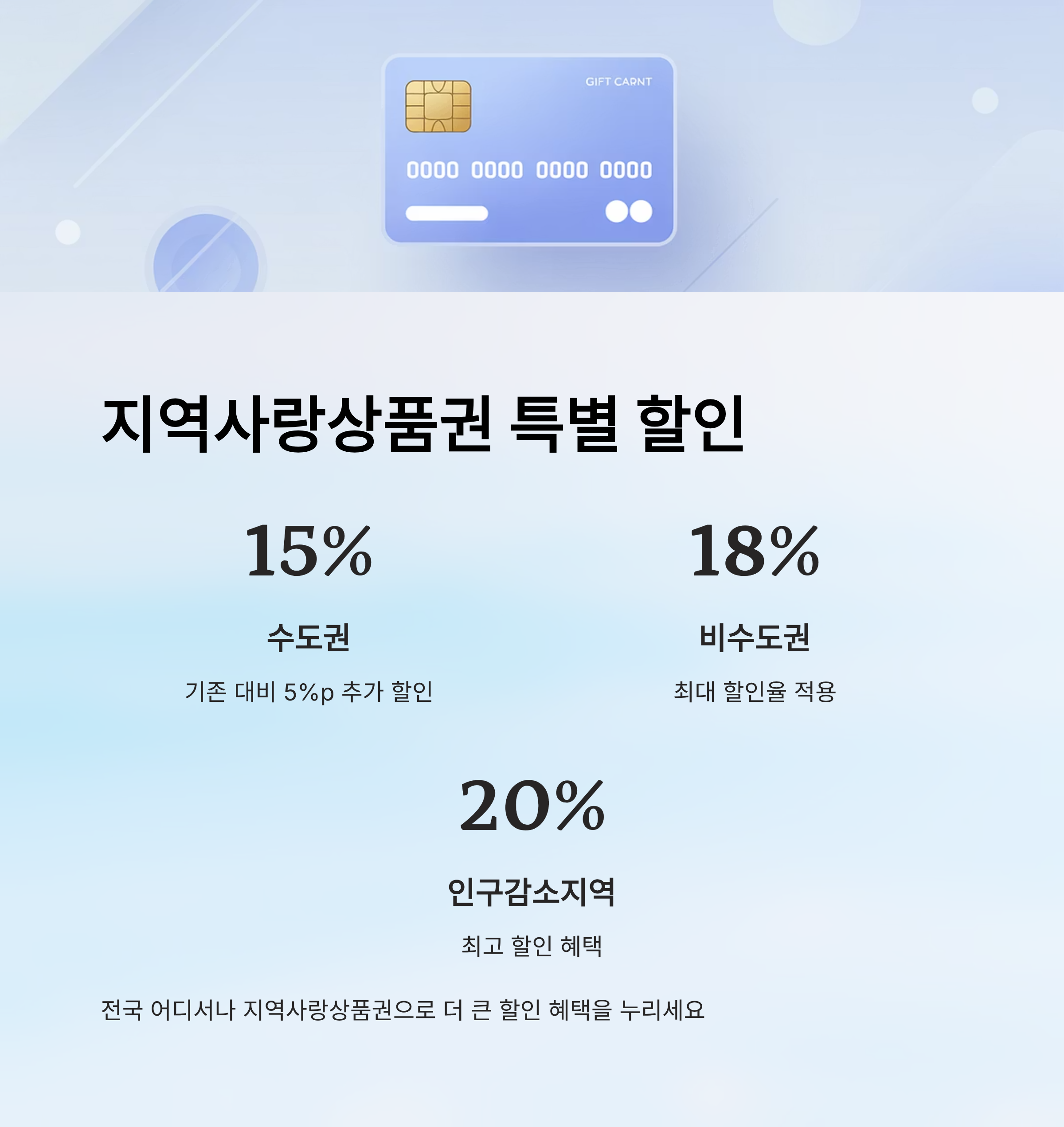 - 수도권 최대 15%, 비수도권 최대 18%, **인구감소지역 최대 20%**까지 할인