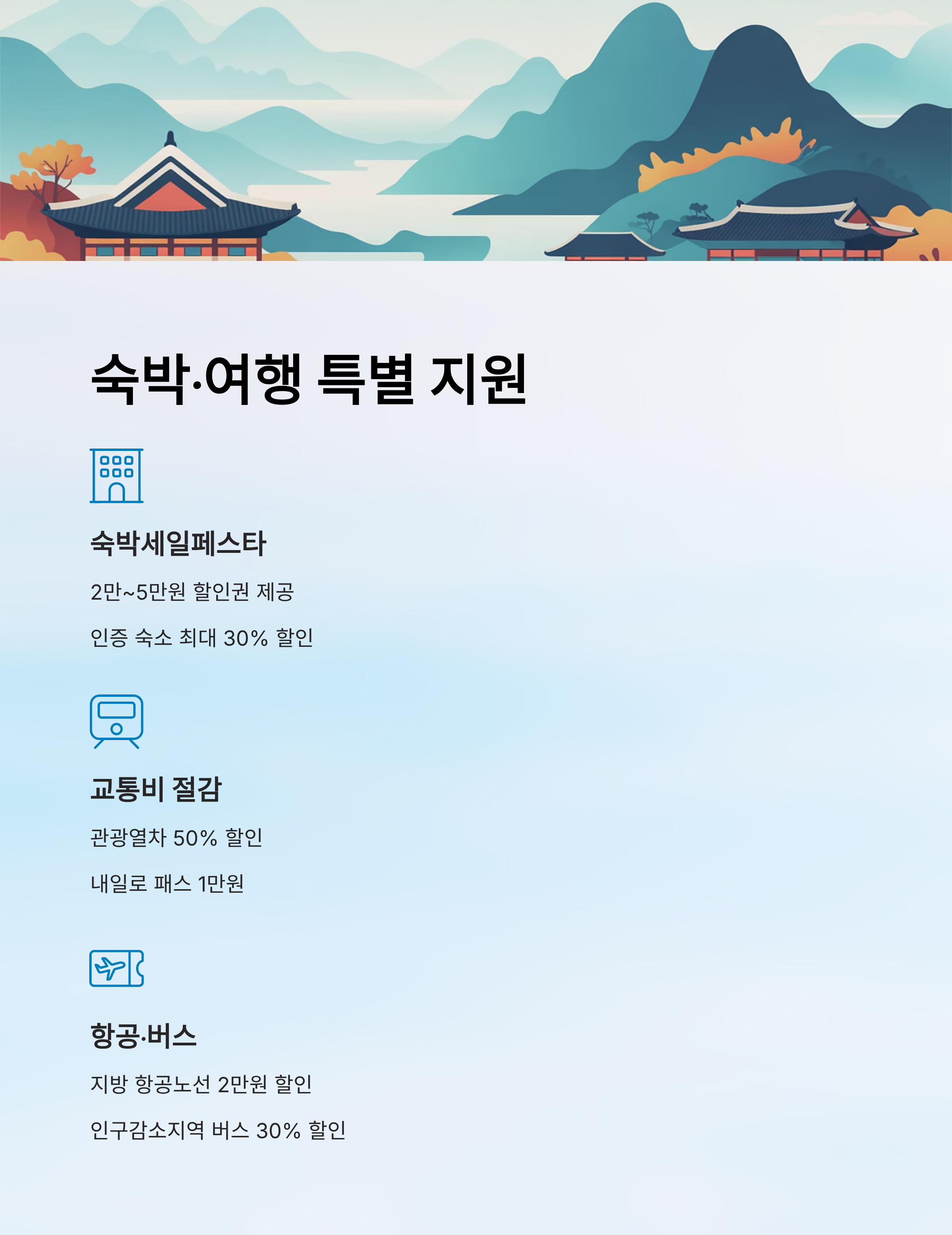 - 관광열차(50%), 내일로 패스(1만원), 지방 항공노선(2만원), 인구감소지역 버스(30%) 등 교통비 절감