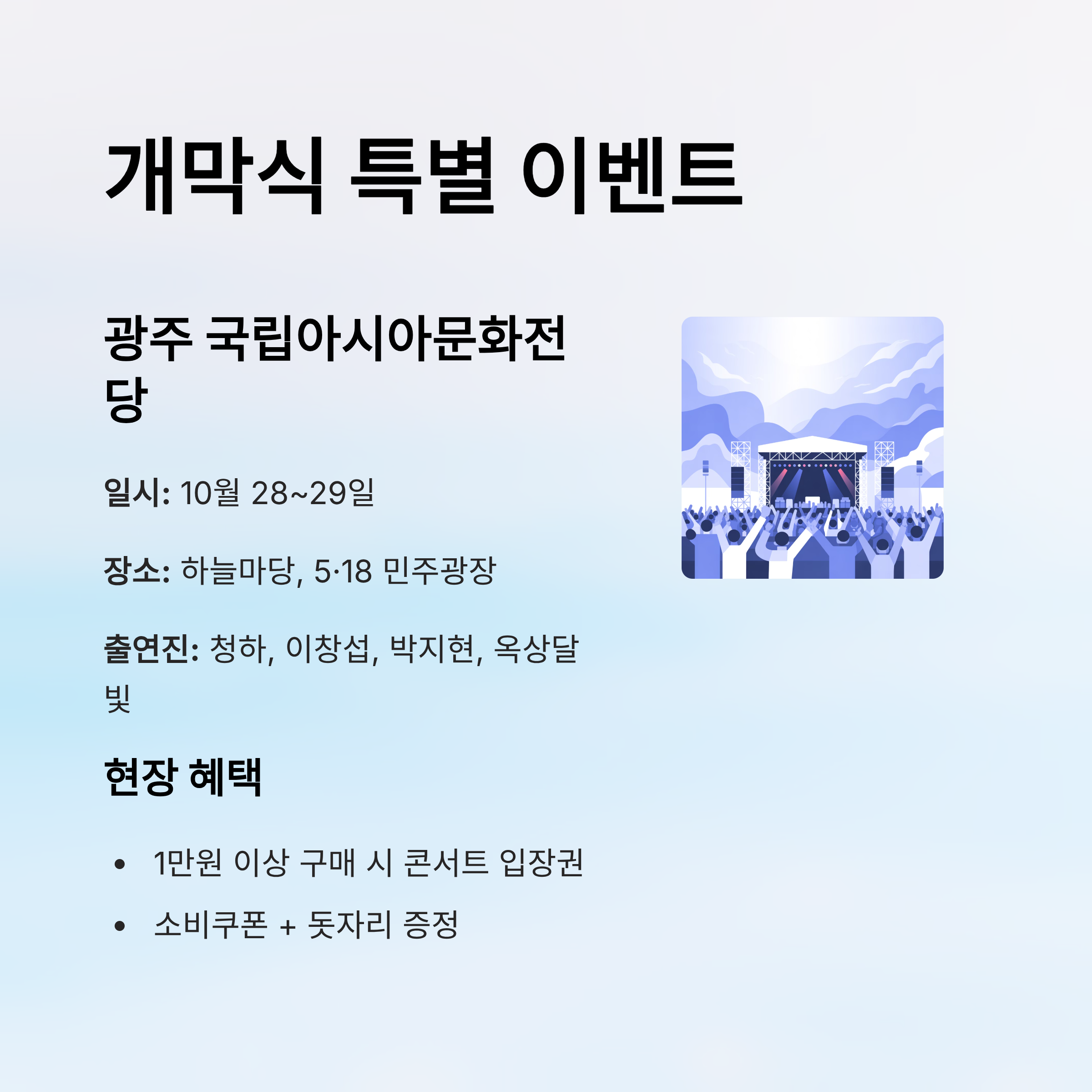 개막식은 10월 28~29일, 광주 국립아시아문화전당 일원에서 열리며, 인기 가수 공연과 현장 소비쿠폰 이벤트 등 풍성한 현장 행사가 마련됩니다.