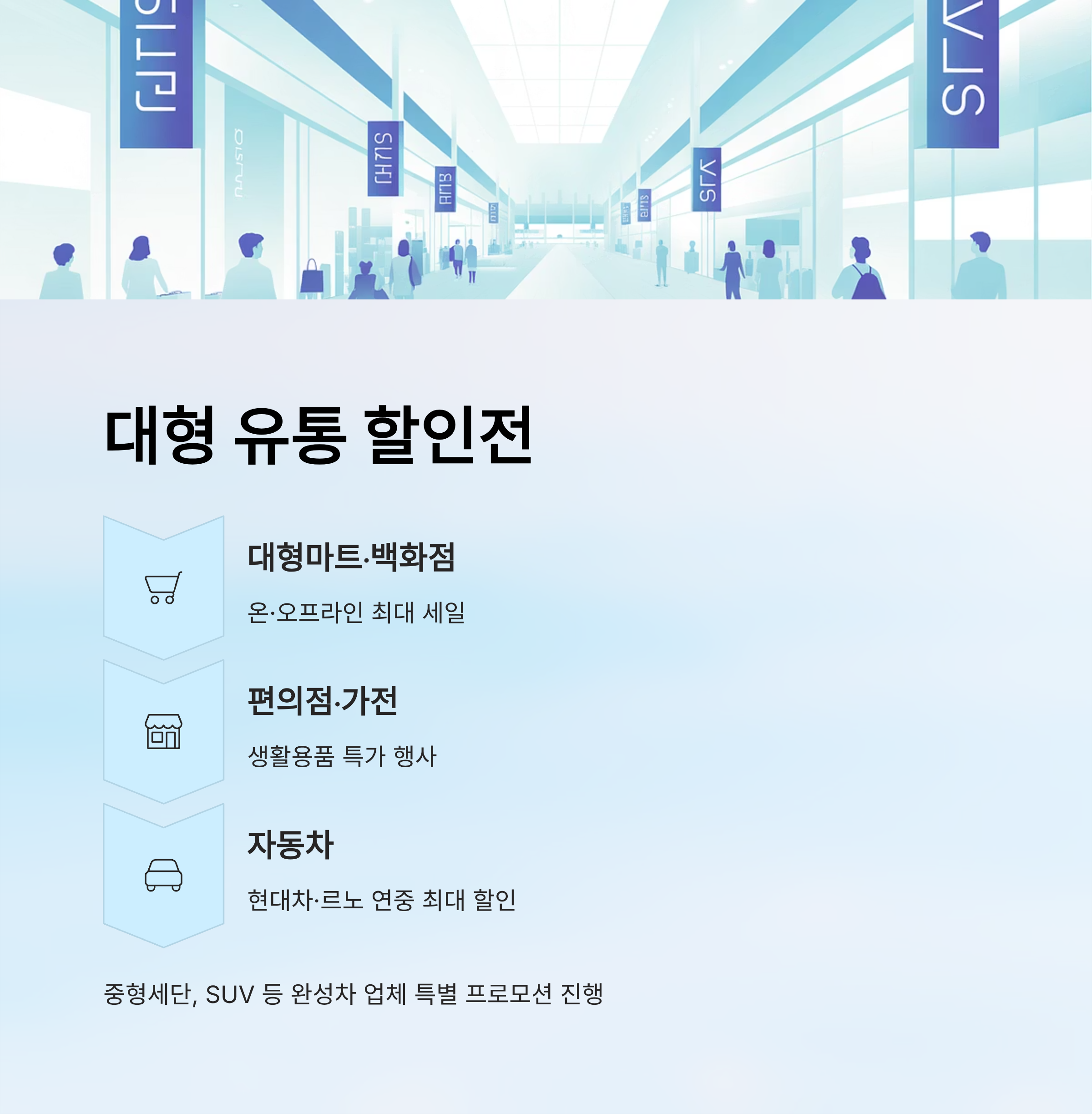 - 대형마트, 백화점, 편의점, 가전 등 온·오프라인 최대 세일