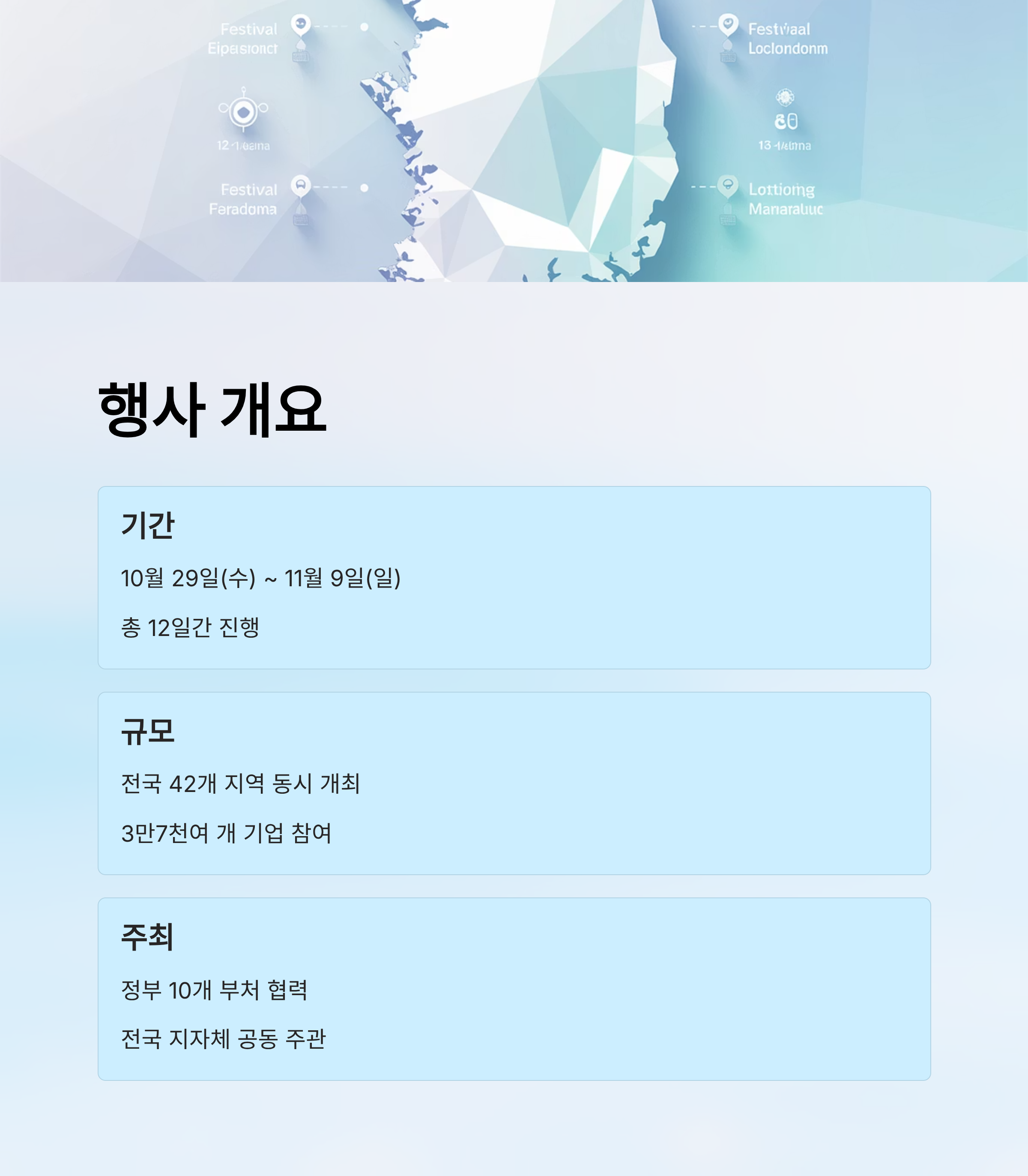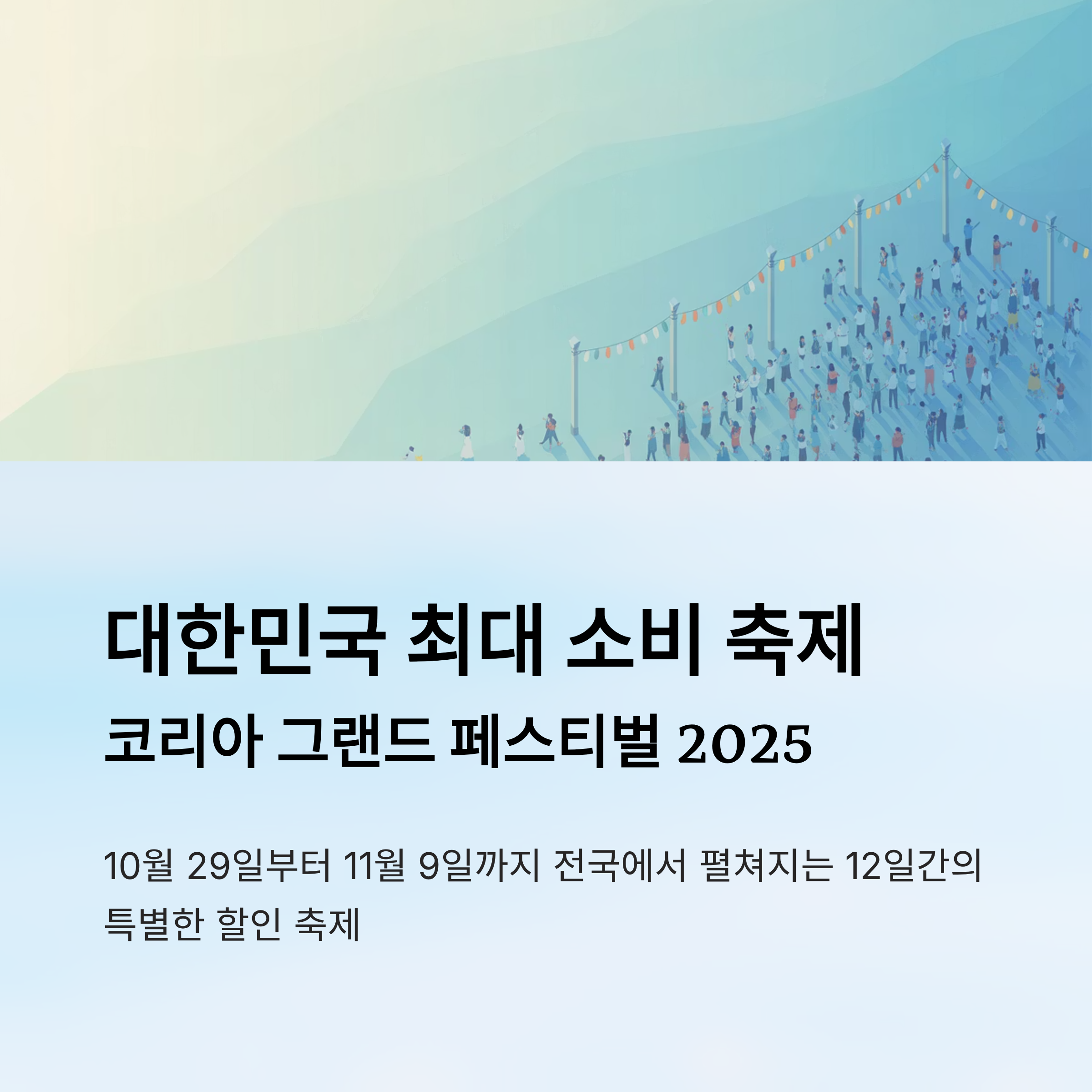 ‘코리아 그랜드 페스티벌 2025’는 10월 29일(수)부터 11월 9일(일)까지 12일간 전국에서 동시에 열리는 대규모 소비·할인 축제입니다.