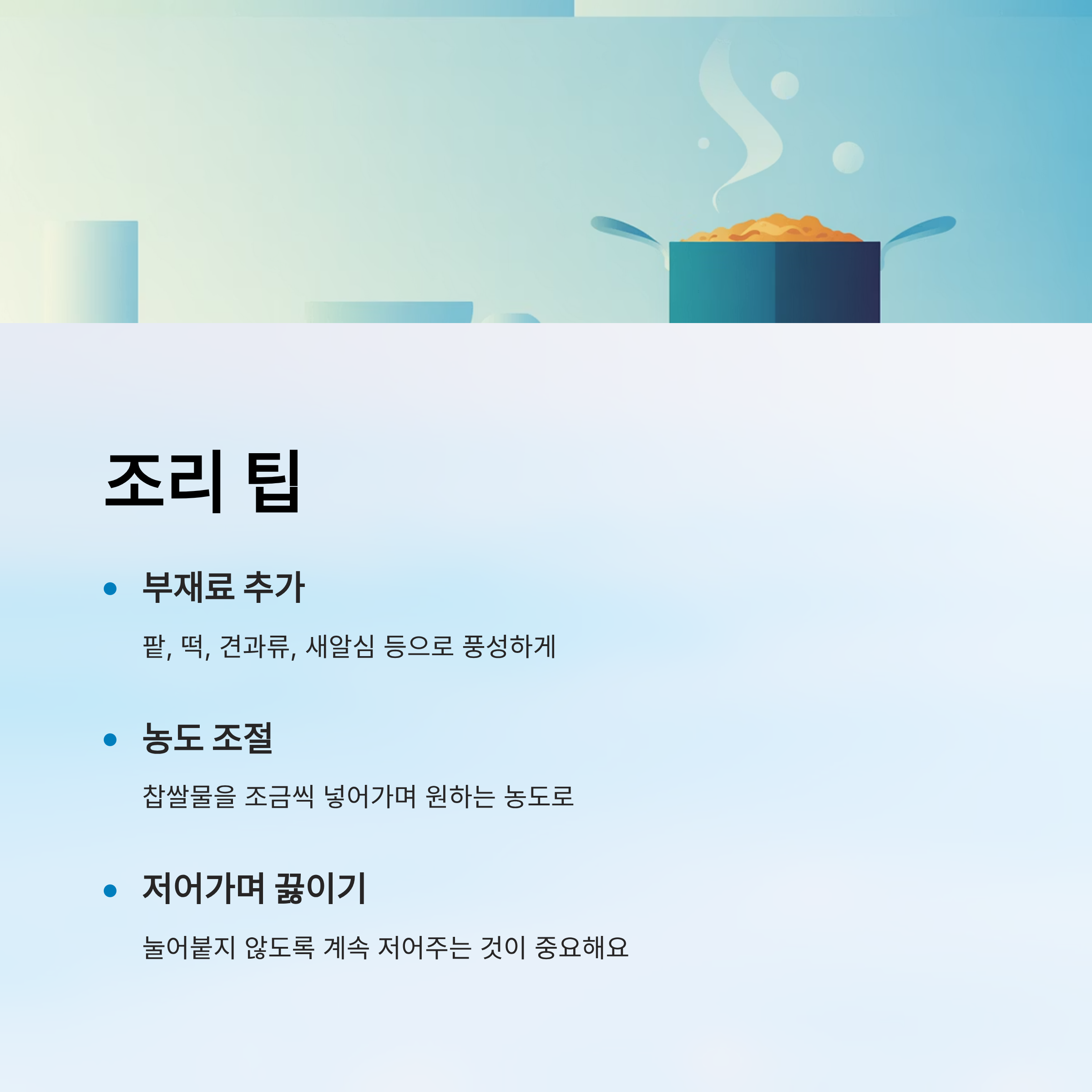 팥, 떡, 견과류, 새알심 등 기호에 따라 부재료를 추가하면 더욱 풍성한 맛을 낼 수 있습니다.
