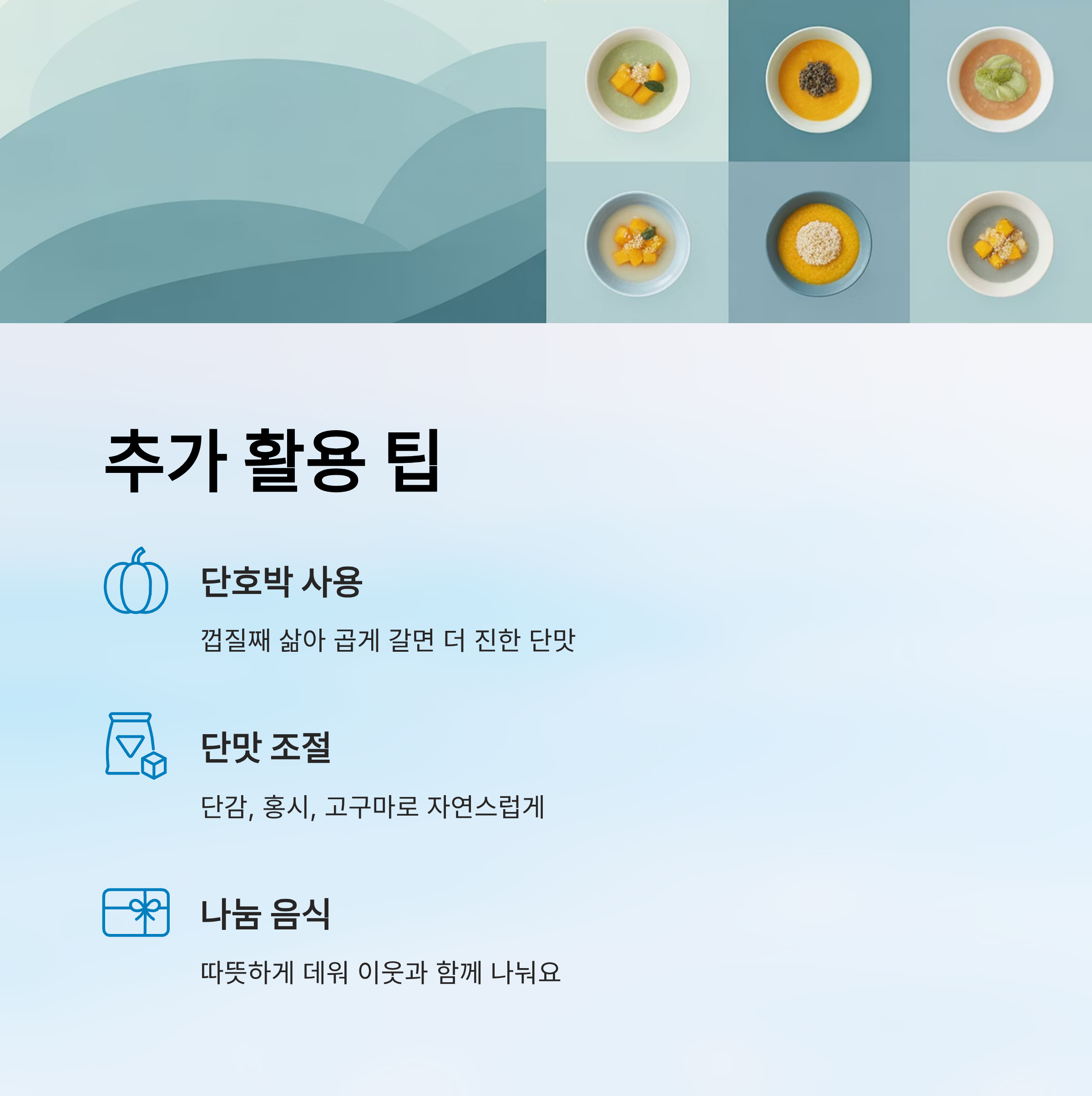 - 삶은 호박은 따로 냉동 보관해 필요 시 바로 사용 가능