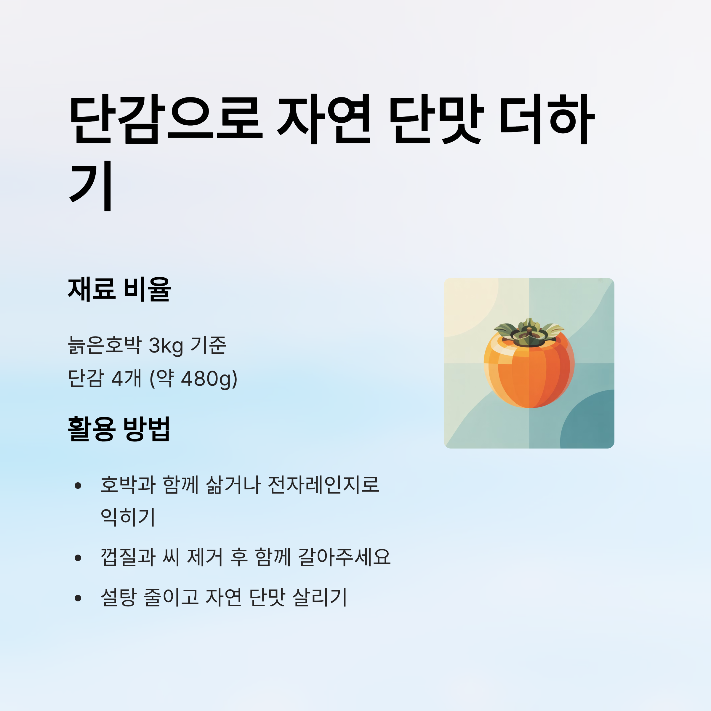 - 단맛 조절: 설탕 대신 단감, 홍시, 고구마 활용 가능