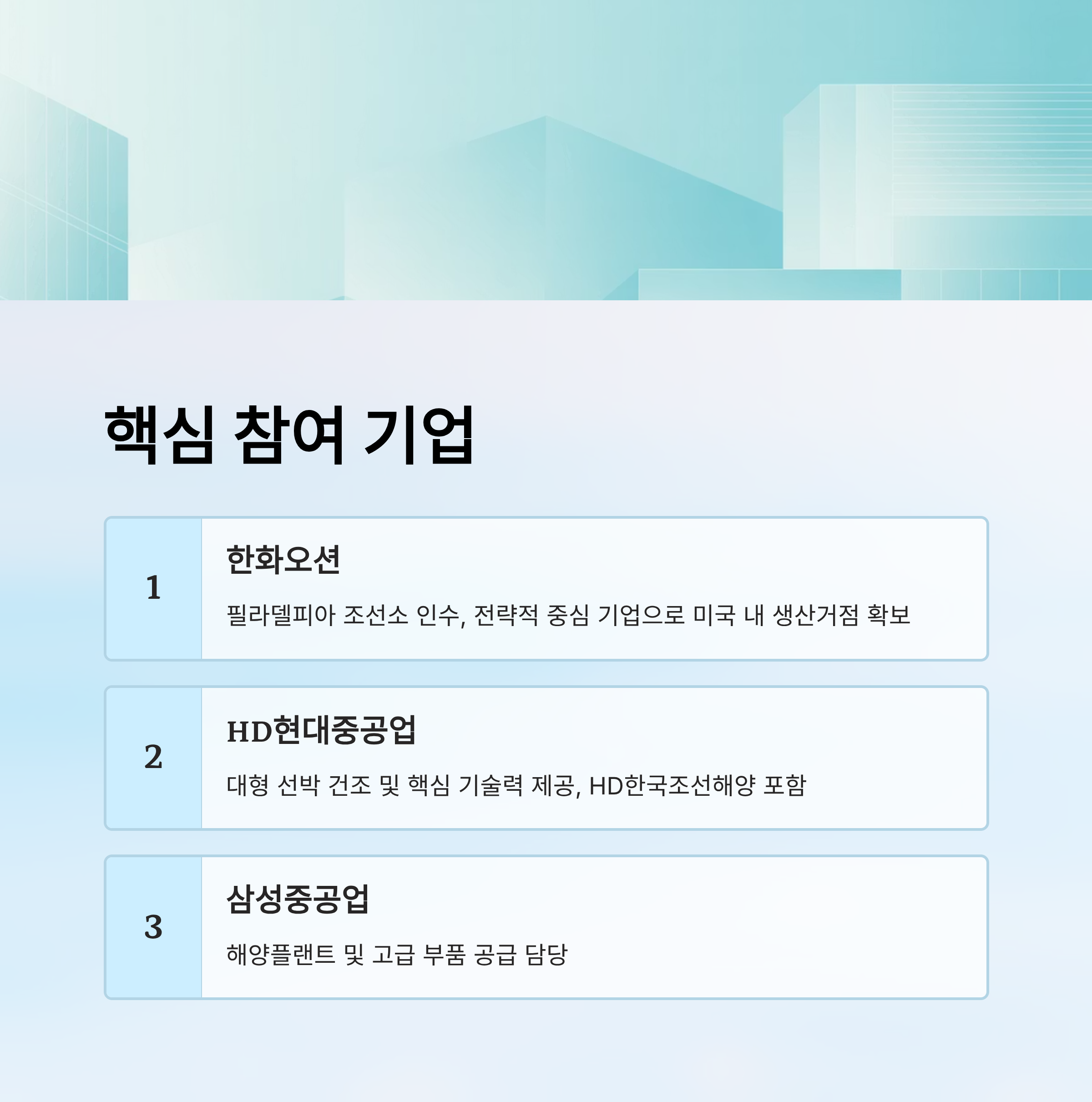 - 한국 조선 빅3(한화오션, HD현대중공업, 삼성중공업)가 기술력과 인프라를 제공하며 미국 시장에 본격 진출합니다.