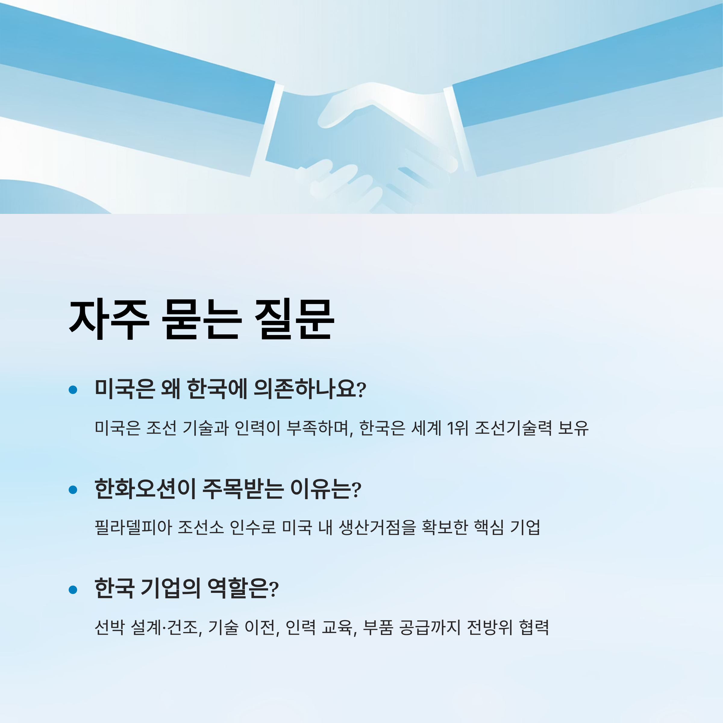 - 미국 조선업 회생의 기술적·인적 핵심 파트너로서 한국의 입지 강화