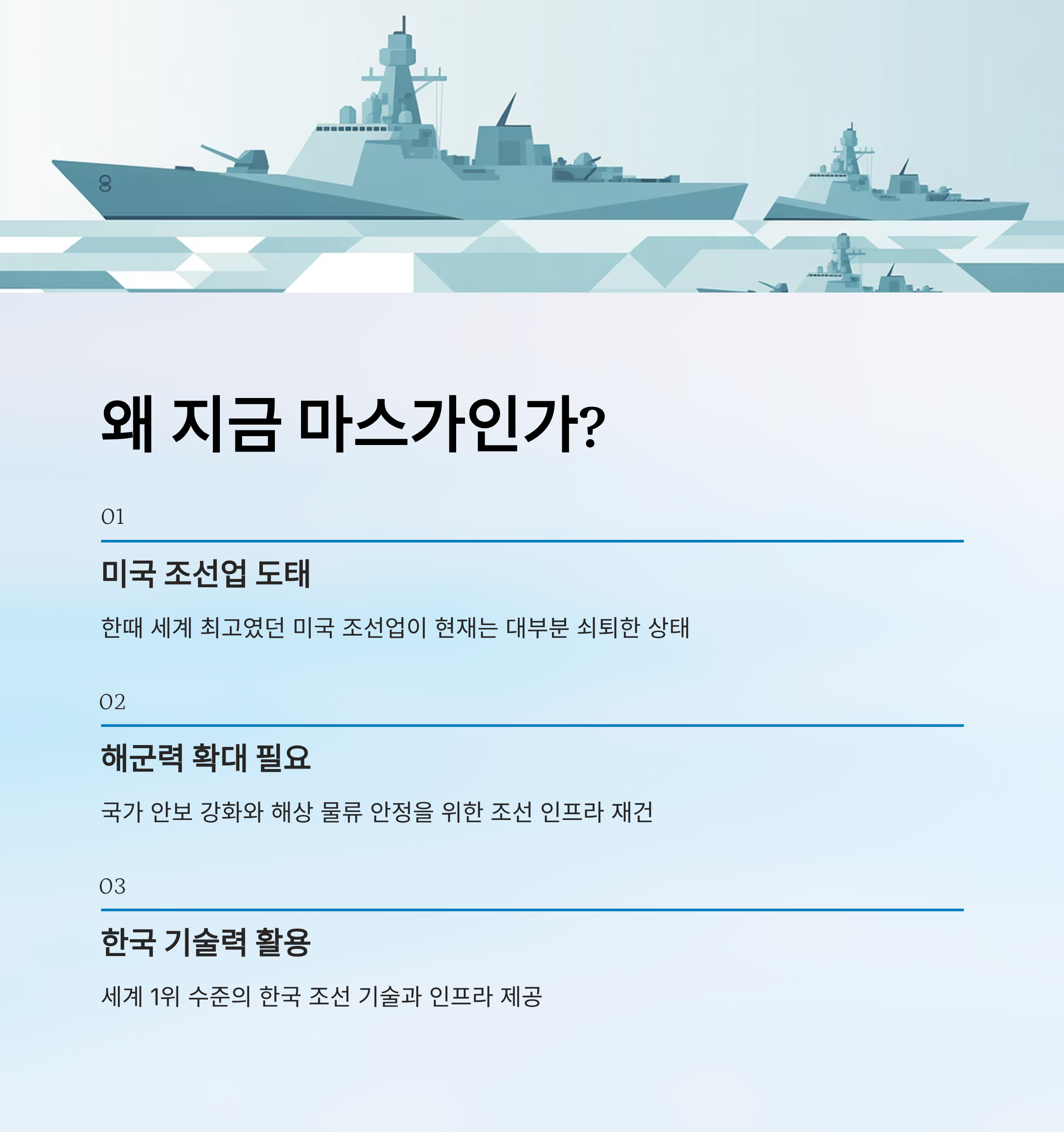- 미국 해군력 확대, 해상 물류 안정, 국가 안보 강화 등을 위해 조선 인프라를 재건할 필요성이 커졌습니다.