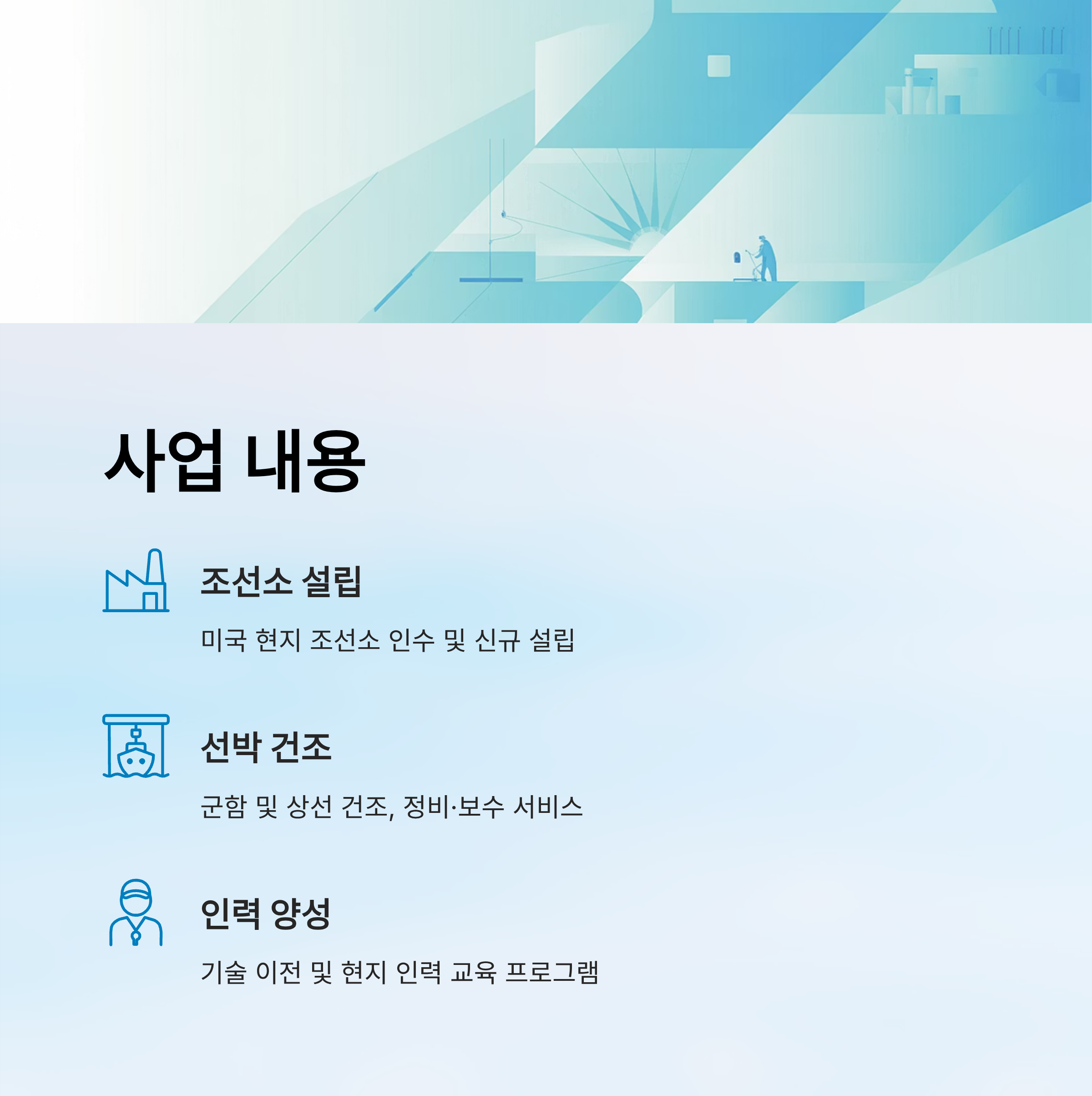 | 사업 내용 | 미국 현지 조선소 인수 및 설립, 선박 건조, 정비·보수, 인력 양성, 기술 이전 |