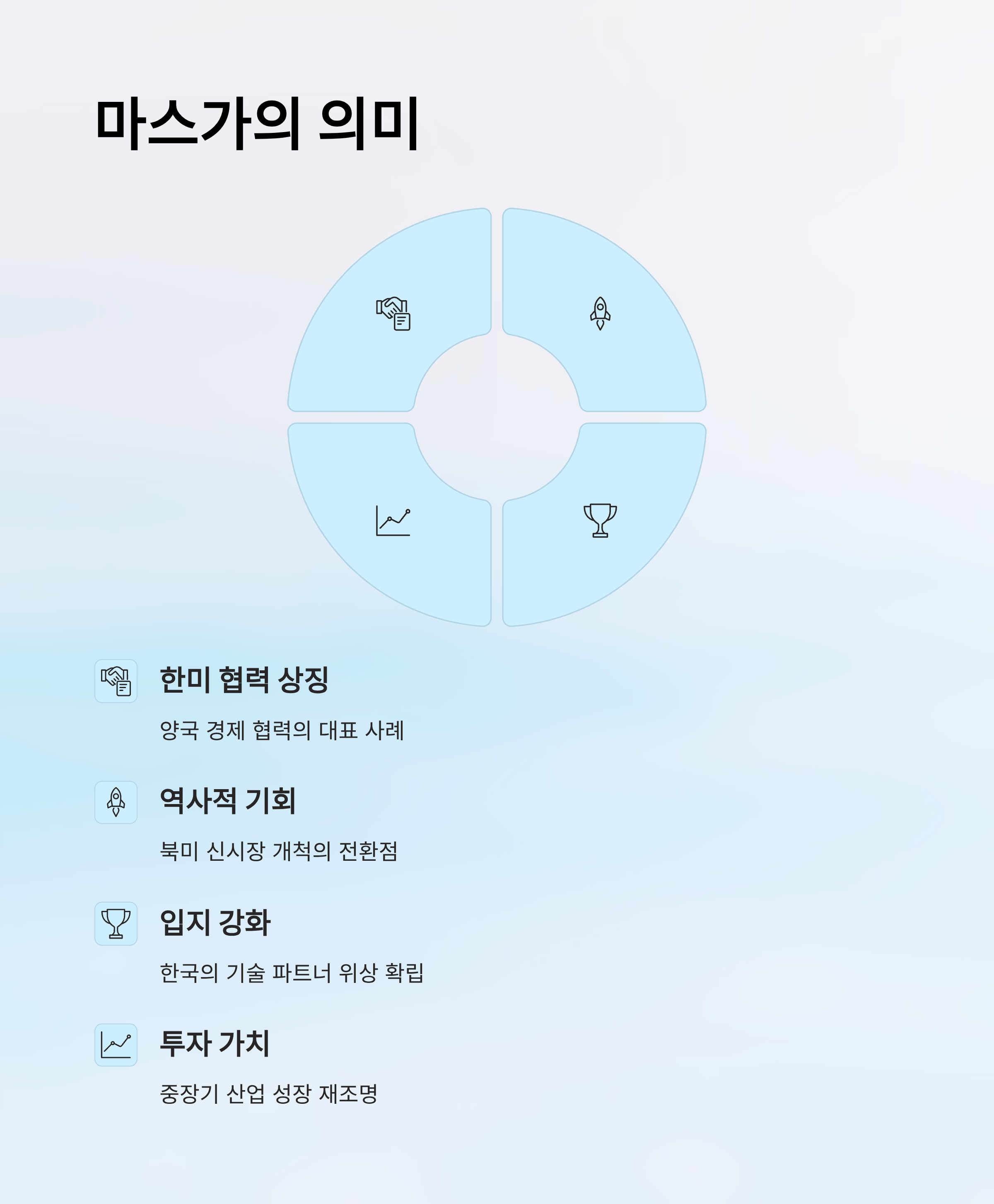 - 양국 간 기술 교류 및 경제 협력이 핵심입니다.
